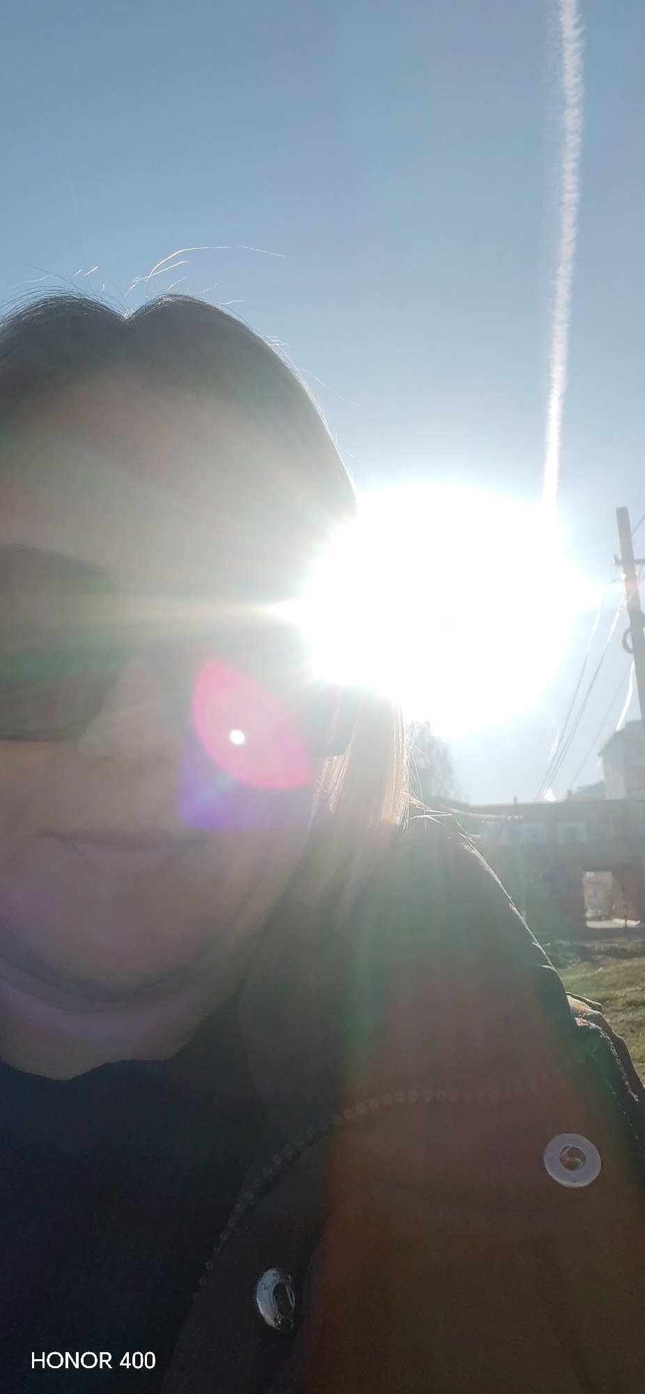 A selfie taken outdoors under bright sunlight obscuring most of the face of a person wearing dark glasses and a dark jacket with metal fasteners. A contrail is visible in the sky. The background inclu…read more