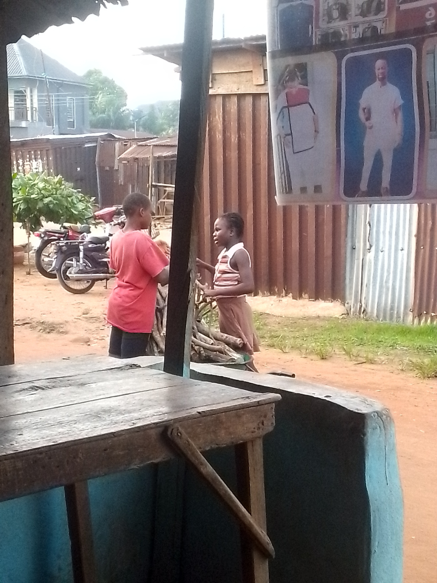 The image shows two children engaged in a conversation next to a corrugated metal structure in what appears to be a rural area of Orlu, Nigeria. One child is wearing a red shirt and black shorts, whil…read more