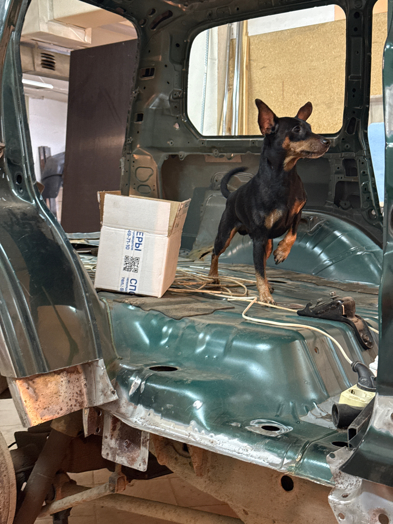 A small, tan and black dog is inside the gutted frame of a vehicle. A white box with Russian text and a QR code is on the frame near the dog. The location is likely in Perm, Russia given the Russian t…read more