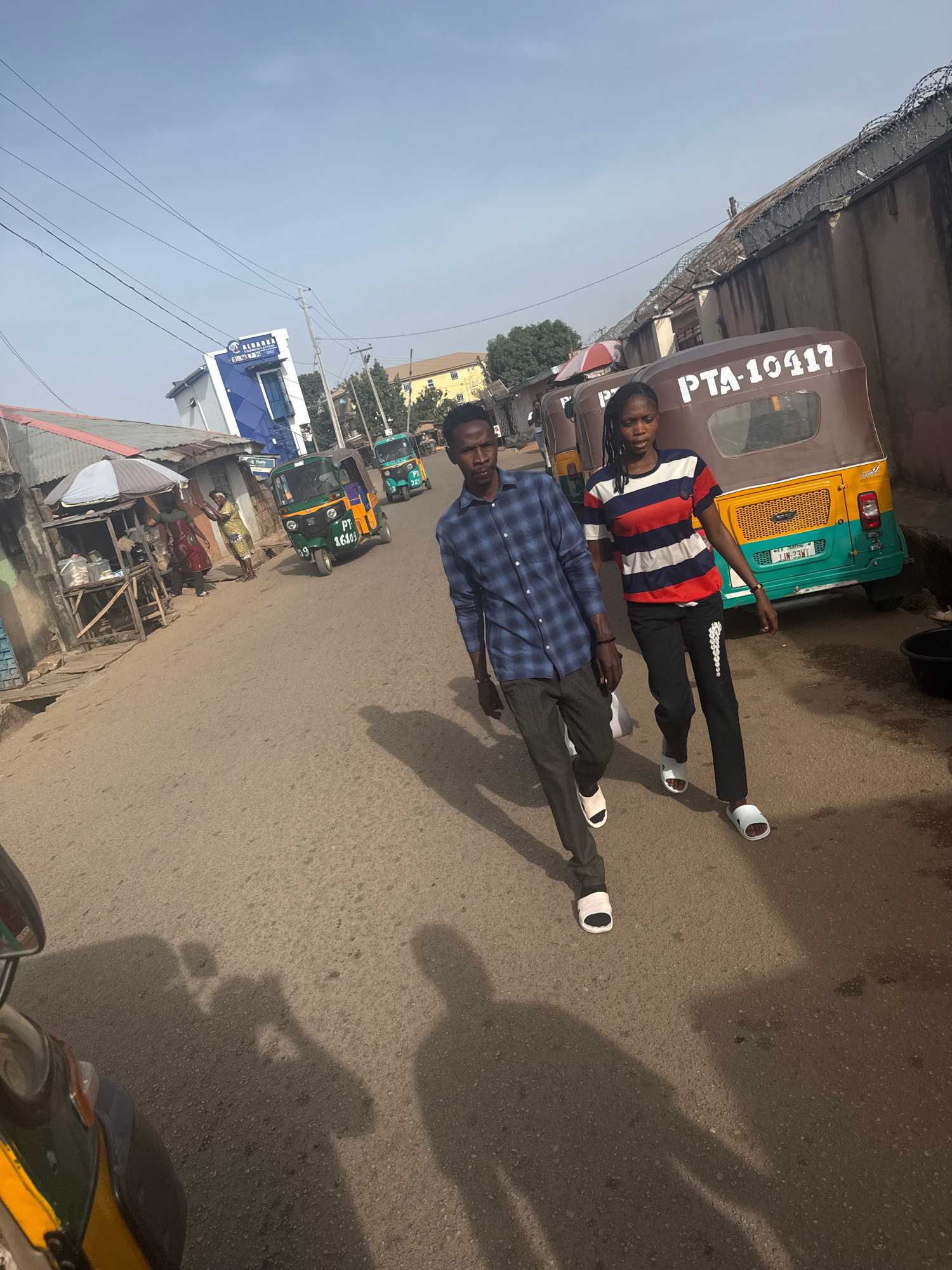 Two people are lying on a street in Jos, Nigeria. One person wears a blue and black checkered shirt, gray pants, and white slide sandals. The other wears a striped red, white, and blue shirt, black pa…read more