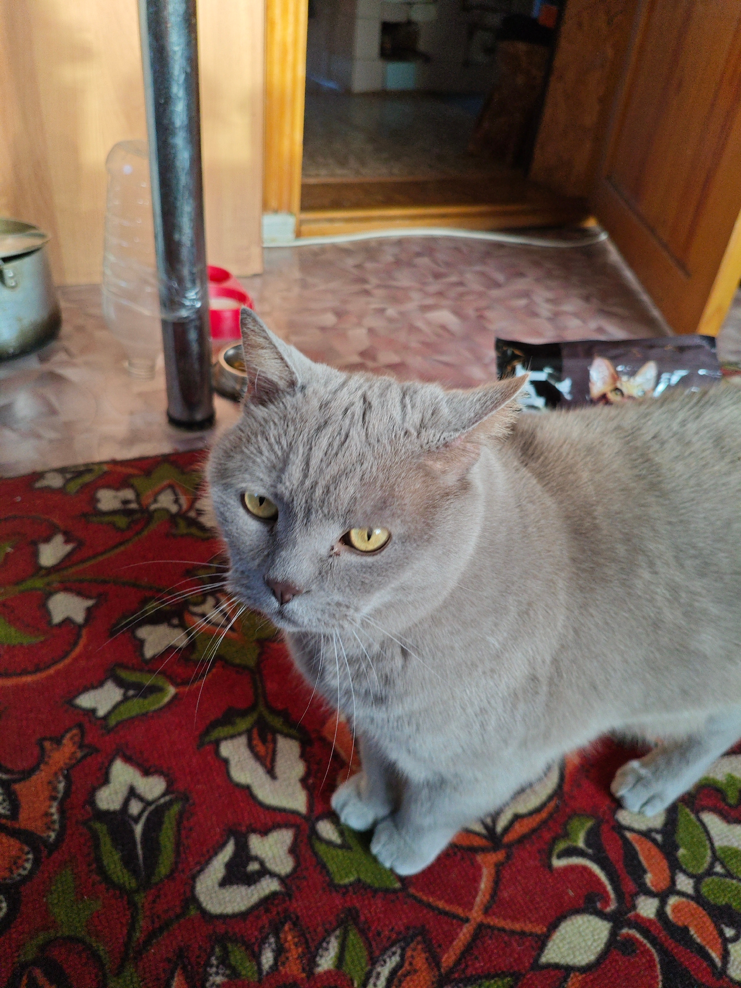 The image depicts an indoor scene within a residence in Dubovaya, Russia. The primary subject is a domestic cat, likely a British Shorthair due to its light grey (lavender/lilac) fur and robust build,…read more