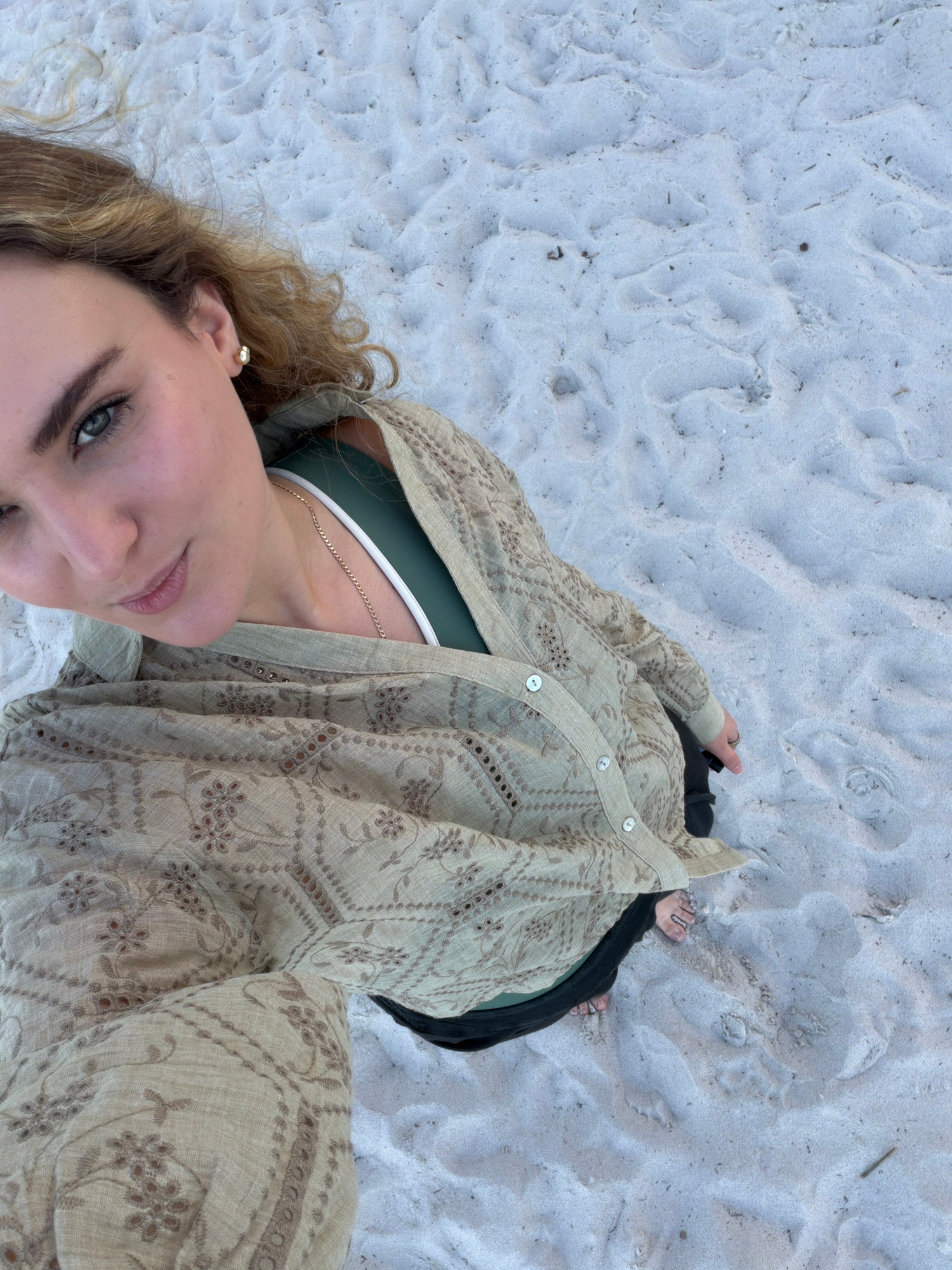 A high-angle selfie shows a woman on a white sandy beach. She is wearing a dark green sports bra, a gold chain necklace, a beige button-down shirt with an embroidered pattern, and dark pants. The loca…read more