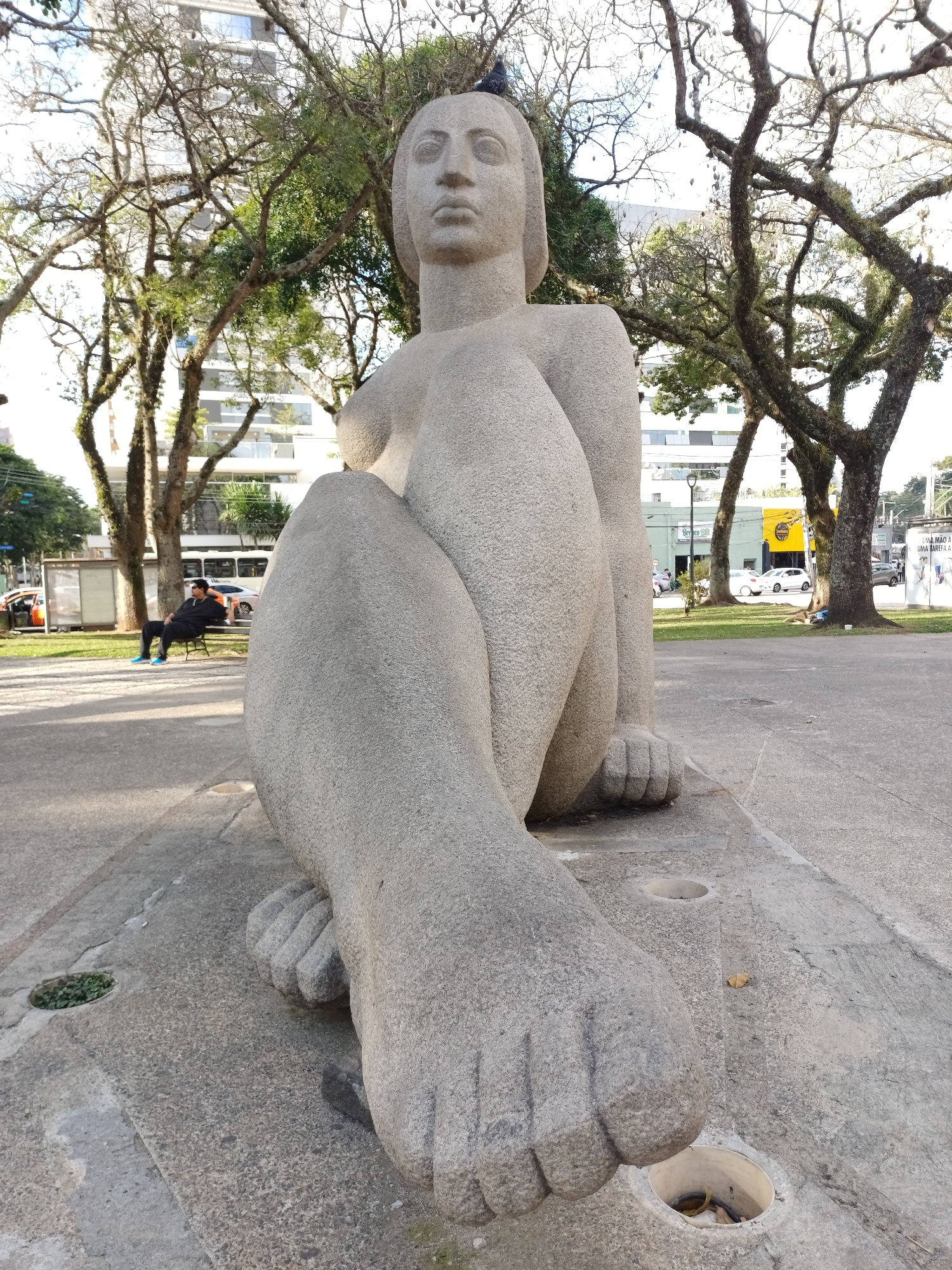 The image, originally rotated, shows a large, light gray stone sculpture of a human figure situated in an urban park or public square. The sculpture depicts a person in a sitting or squatting posture,…read more