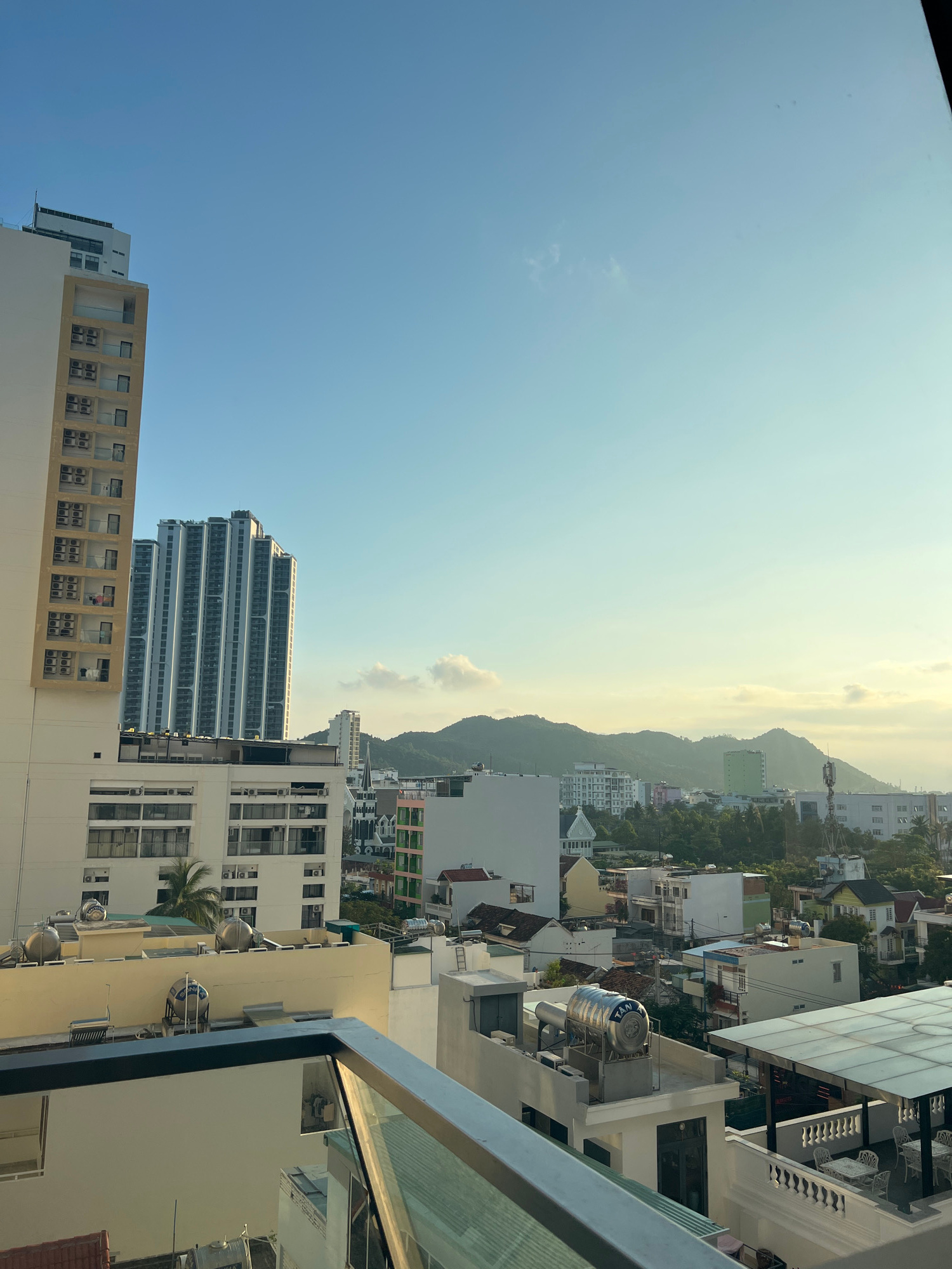 The image depicts an elevated view of Nha Trang, Vietnam, on a clear day. In the foreground are buildings of varying heights and architectural styles, including a modern high-rise residential building. The skyline transitions to a mountainous backdrop, partially obscured by a haze. Smaller buildings and residential structures are interspersed among the trees and slopes. The overall composition suggests a city nestled between urban development and natural landscapes. | Open Wire