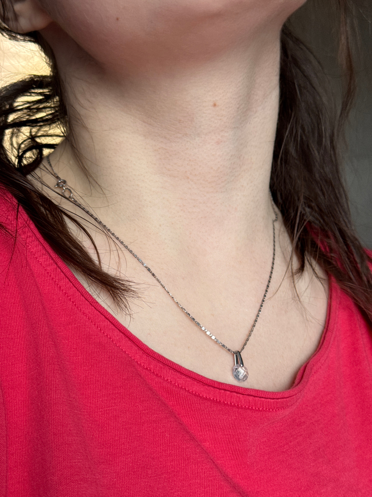 A close-up, angled shot captures the upper chest and neck area of an individual, seemingly in Izhevsk, Russia. The person, whose face is not visible, is wearing a red, possibly cotton, t-shirt or garm…read more