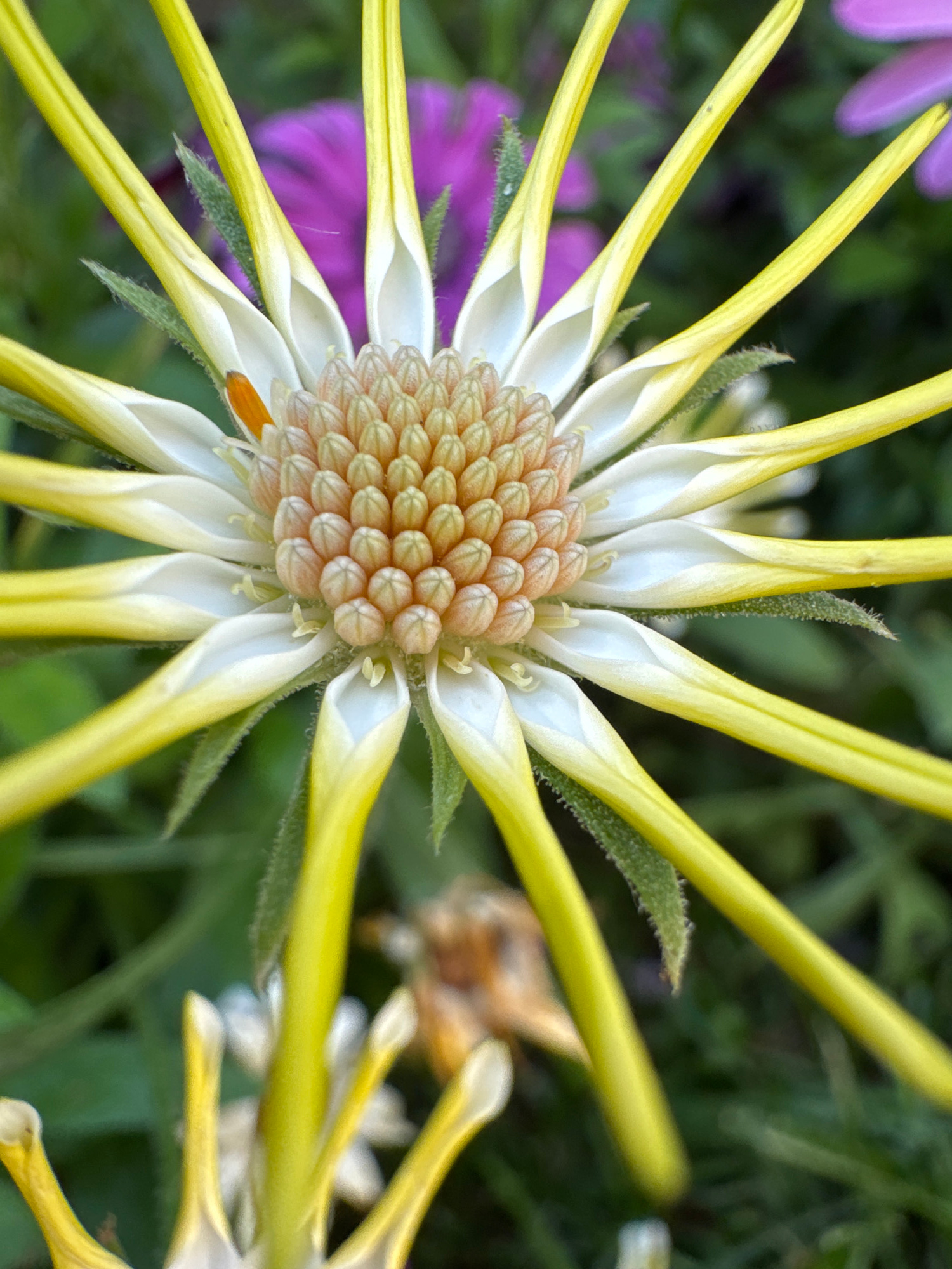 This close-up photograph, taken in Aprilia, Italy, features the intricate details of a bright yellow and white flower, likely a type of daisy or coneflower. The flower is captured from a top-down pers…read more