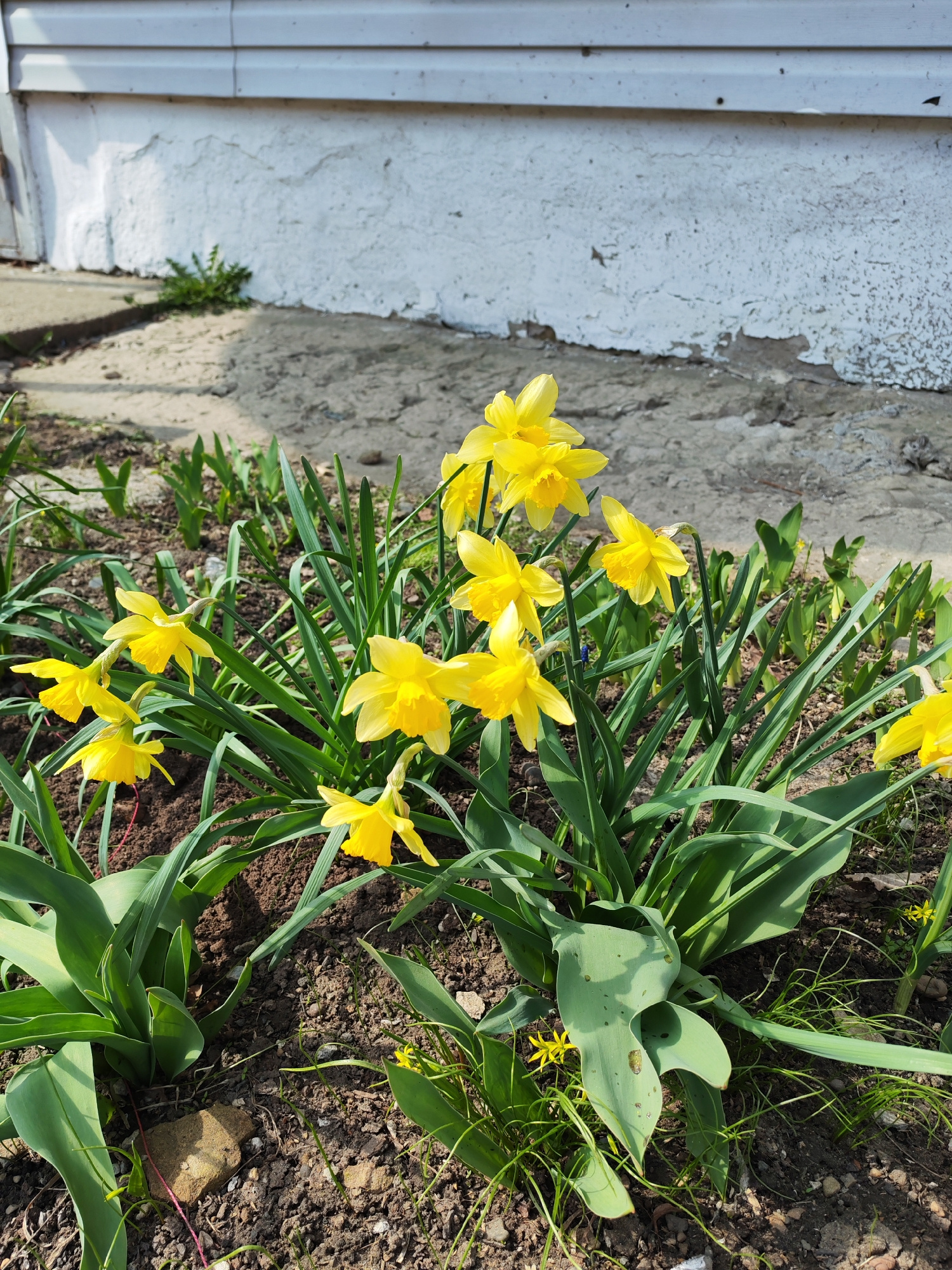 A close-up shot shows a cluster of bright yellow daffodils in full bloom in a garden setting. The flowers are the focal point, surrounded by long, green leaves. The garden bed consists of dark soil, w…read more