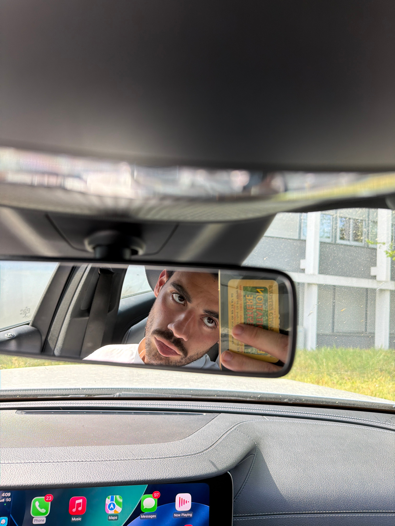 The image shows the interior of a car, specifically the rearview mirror reflecting a man holding a parking validation sticker. The car's dashboard and a digital tablet displaying app icons are visible…read more