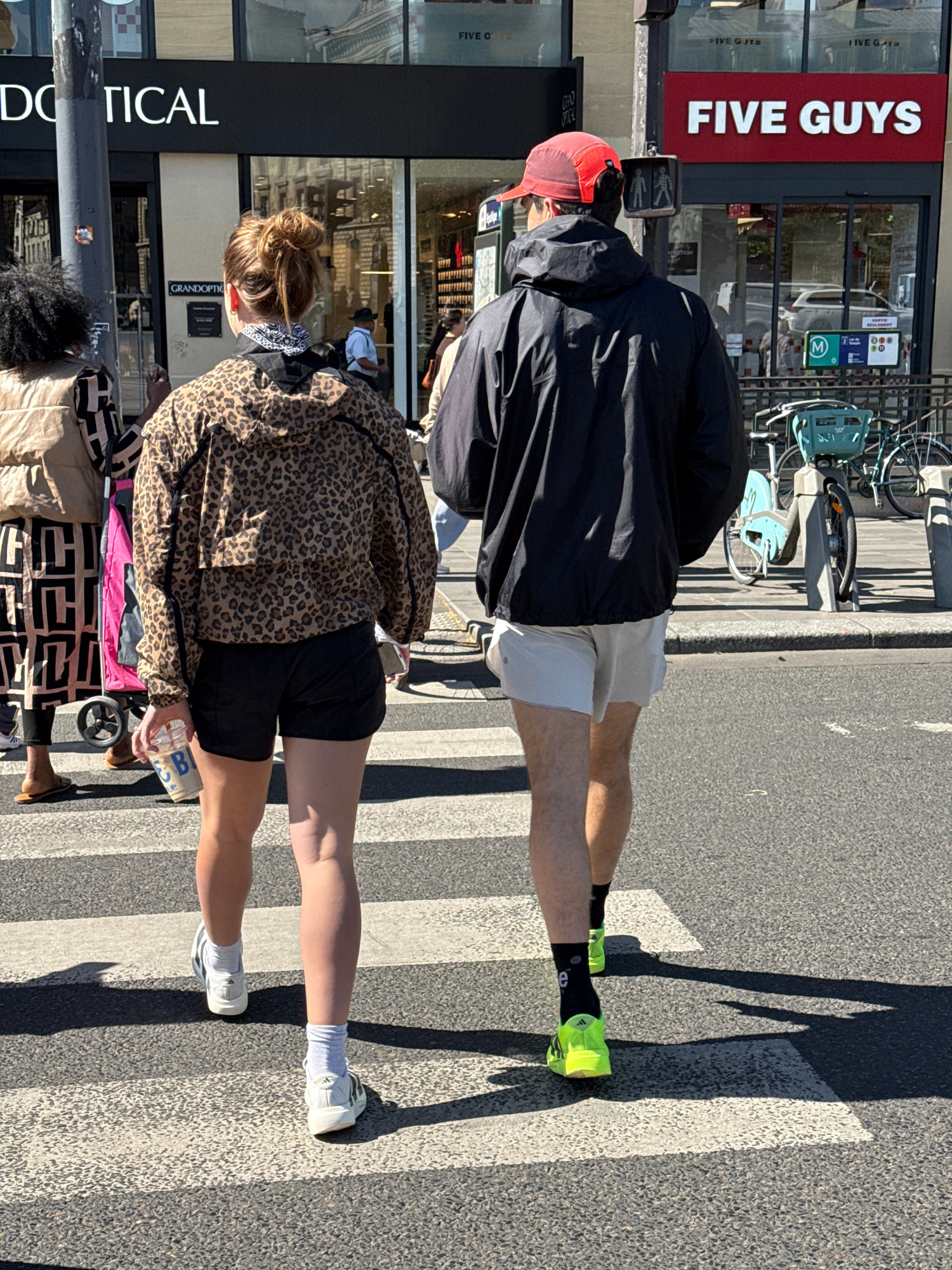 The image shows two people walking across a zebra crossing in Paris, France. The first person, closer to the camera, is wearing a leopard-print jacket, black shorts, white socks, and white sneakers.…read more