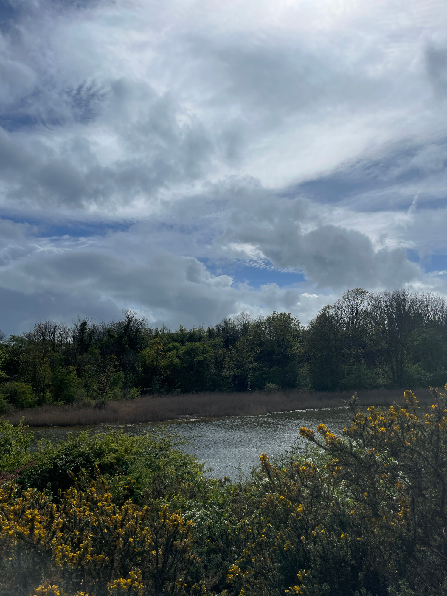 The image captures a tranquil outdoor scene along a waterway, likely a canal or river, under a dynamic sky. The perspective looks along the length of the water body, which appears calm with subtle ripβ¦read more