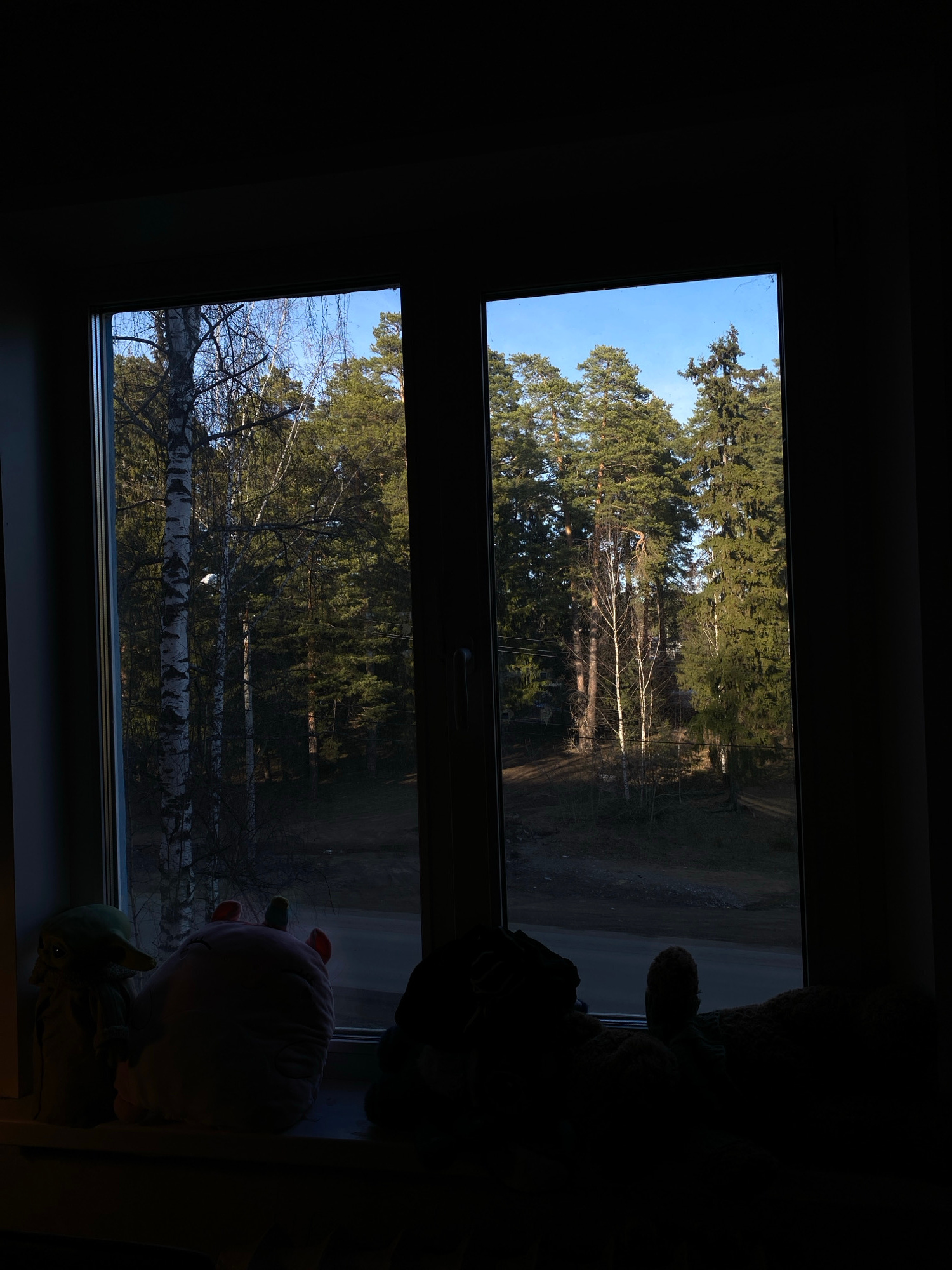 A view through a double-paned window, likely in Votkinsk, Russia, reveals a forest. The window is split into two panes, offering similar views: coniferous and birch trees under a partly clear sky. An…read more