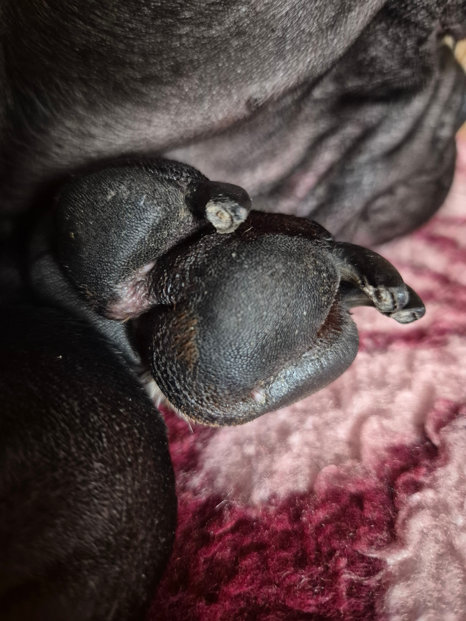 The image shows a close-up of the paws of newborn, black-furred puppies resting on a pink and burgundy-colored soft blanket. The paws are stacked, with toes visible. The image location is not discerni…read more