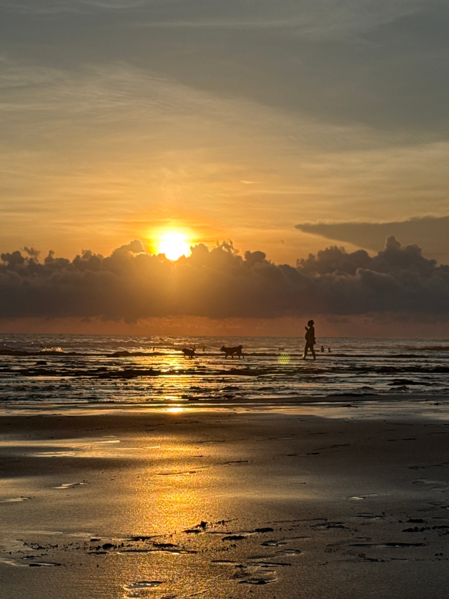 A breathtaking sunset illuminates a beach scene, likely in Mengwi, Indonesia. The sun, a brilliant golden orb, is low on the horizon, partially obscured by dramatic, dark clouds that are silhouetted a…read more