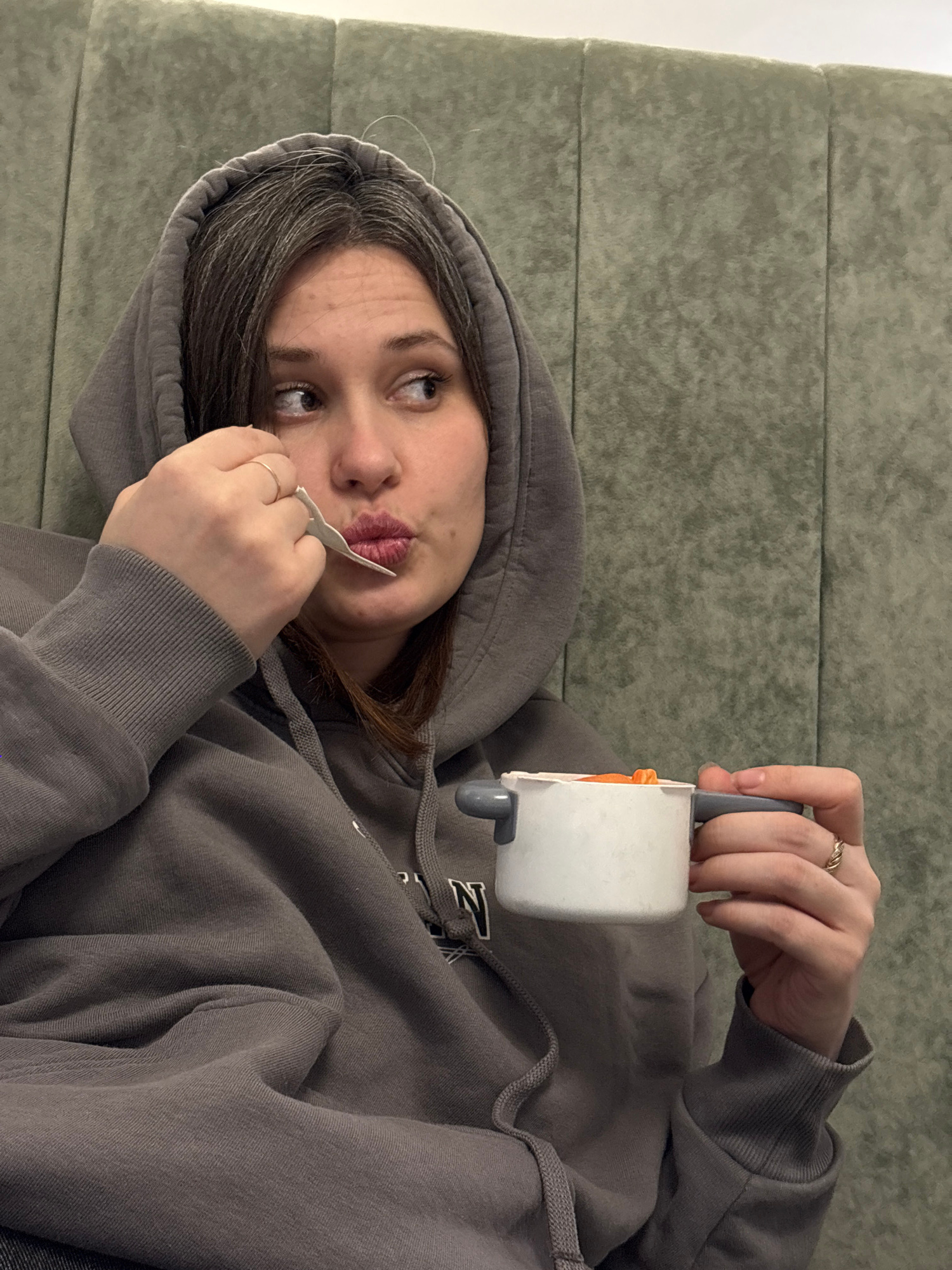 A woman in a grey hooded sweatshirt lies on a green upholstered surface, holding a lint roller in her right hand. She is holding a small piece of paper or film up to her face with her left hand. She i…read more