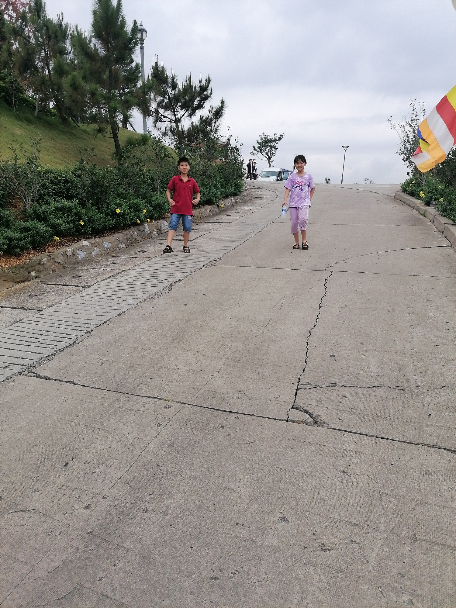 The image captures an outdoor scene featuring two children on a paved, sloping road under an overcast sky. The setting appears to be a hilly area with lush greenery, possibly in Hong Gai Ward, Vietnamβ¦read more