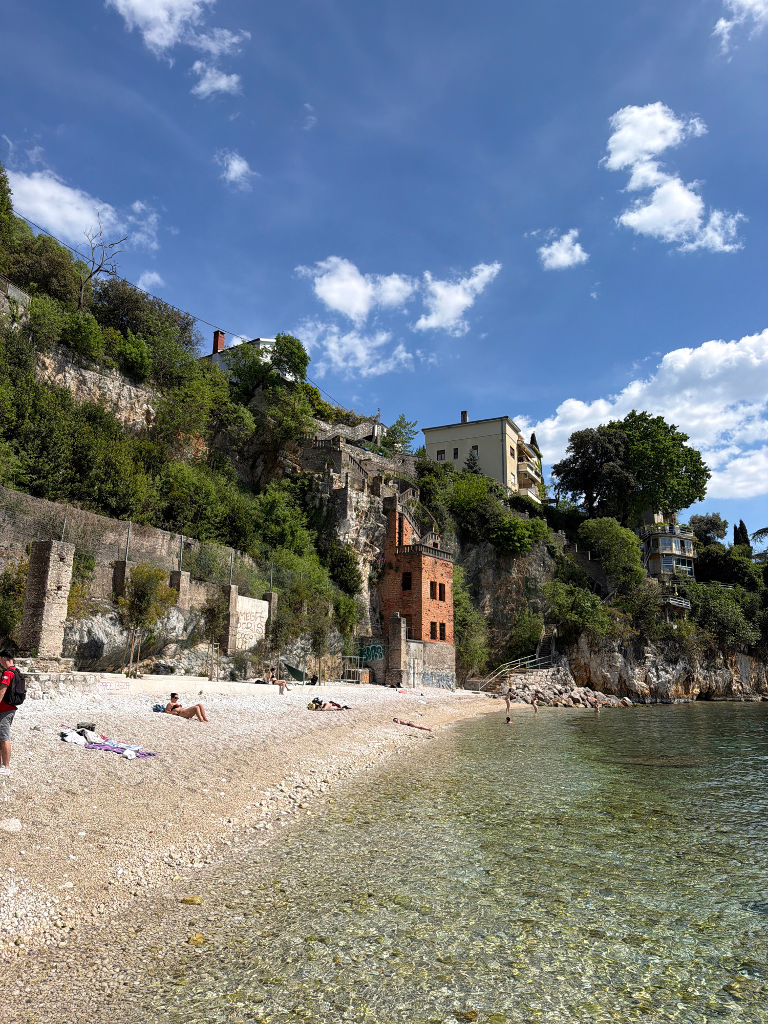 This media file captures a sun-drenched coastal scene, likely in Grad Rijeka, Croatia. The image showcases a pristine pebble beach and incredibly clear, shallow water, bordered by a steep, verdant cliβ¦read more