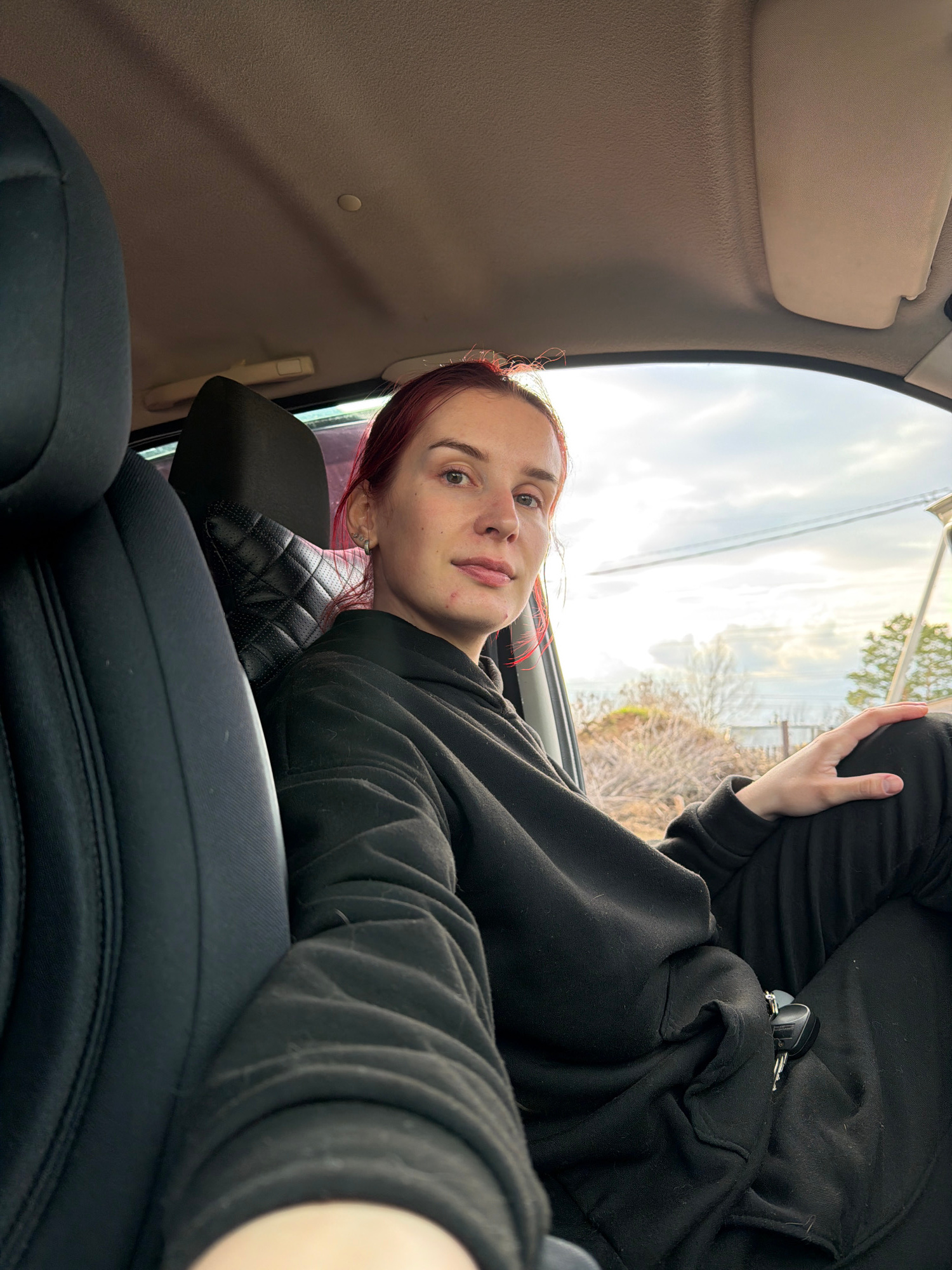 A medium close-up, horizontally oriented photograph depicts a young woman inside a car, looking directly at the camera. The image is originally rotated approximately 90 degrees clockwise, making the w…read more