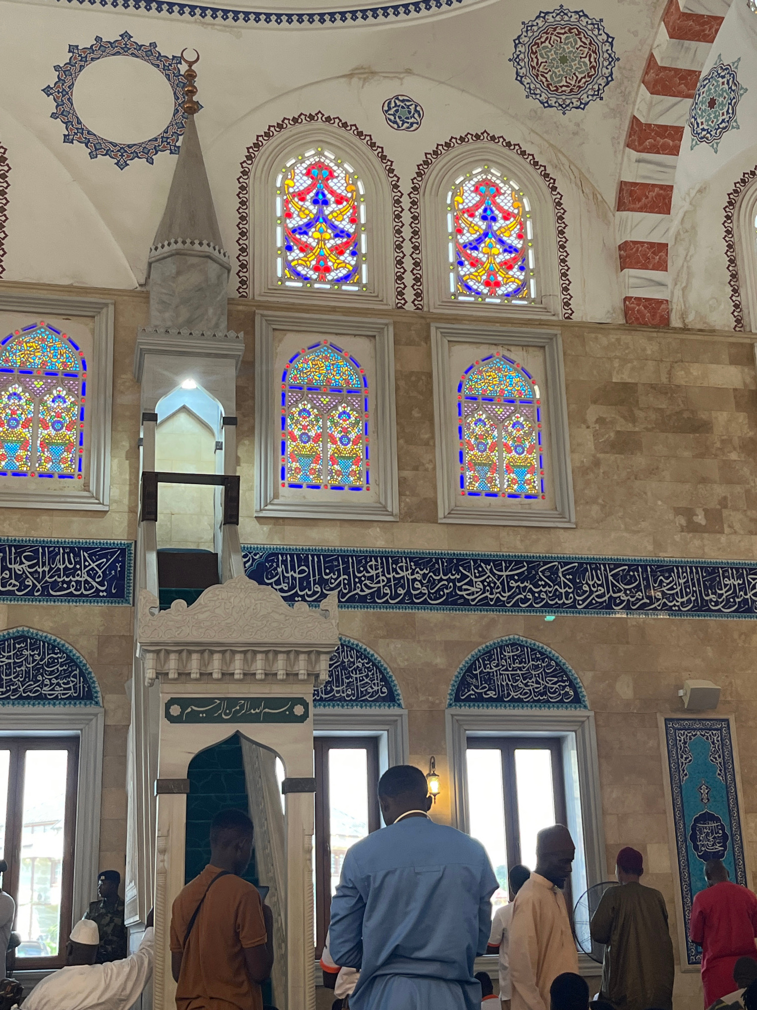 The image shows the interior of a mosque in Accra, Ghana, during what appears to be daytime. Several men are depicted from behind, standing in rows, seemingly engaged in congregational prayer or relig…read more