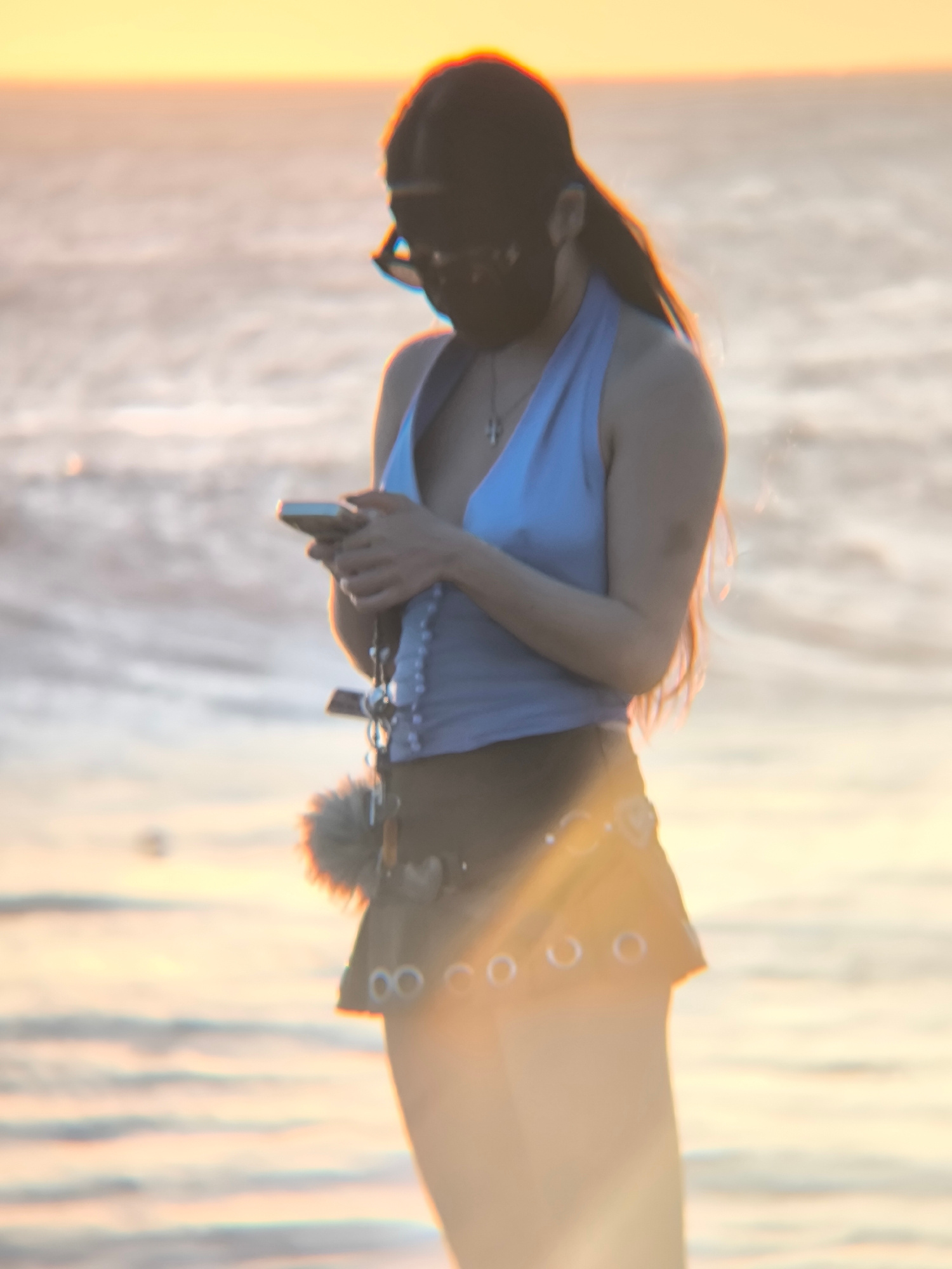 A woman stands on a beach, looking at a mobile phone. She wears a light blue halter top, a brown mini skirt with silver rings, and a black hat. She also wears a necklace with a cross. The background s…read more