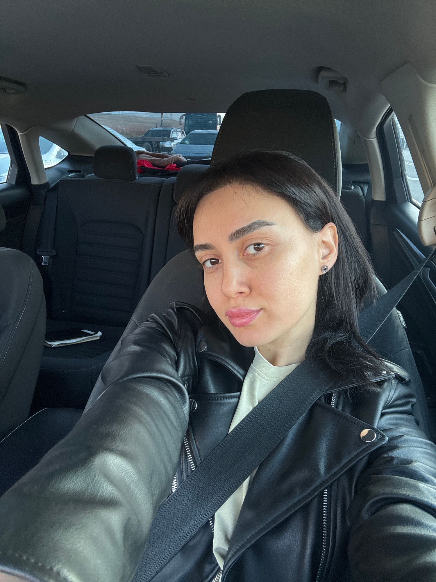 A woman sits in the driver's seat of a car, wearing a black leather jacket and a white shirt, with a seatbelt fastened across her chest. The interior of the car is black and grey. A sunroof is visible…read more