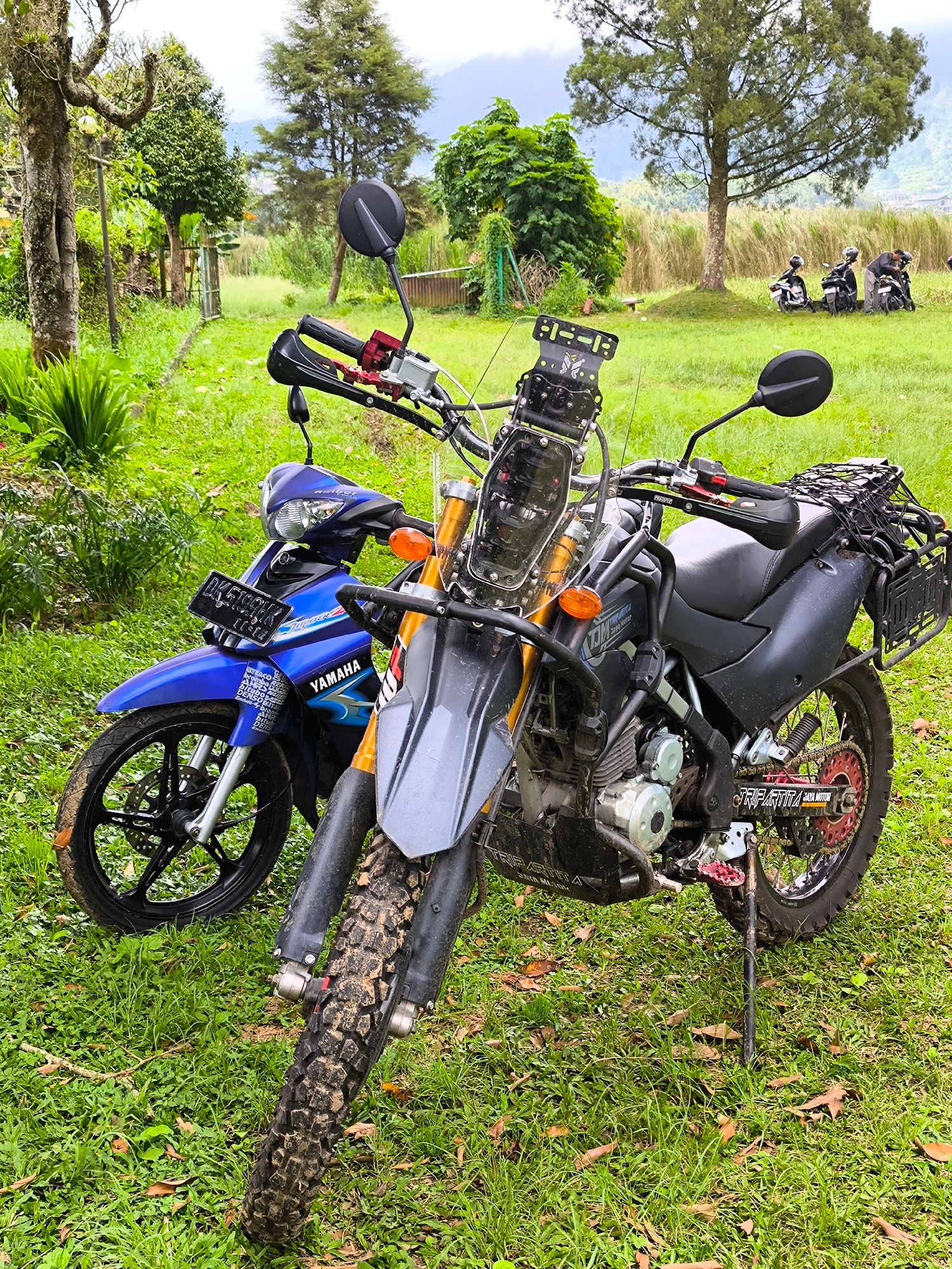 The scene depicts two motorcycles parked on a grassy field in Bedugul, Indonesia. The first motorcycle is a blue Yamaha, with license plate DK 61CQH, and is situated to the left of a larger, grey dirt bike. The dirt bike has a windshield and several attachments, and appears to have been driven off-road, indicated by the mud on its tires. In the background, three individuals are standing near additional motorcycles. The environment includes lush green grass, trees, and a slightly blurred mountainous landscape in the distance. The scene is captured in daylight. | Open Wire