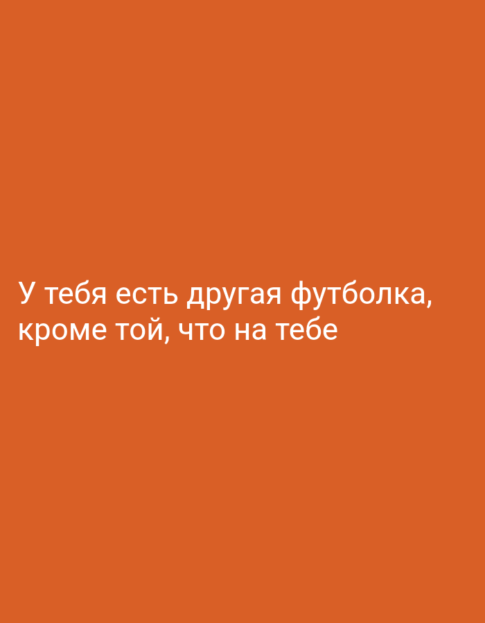 The image shows an orange background with the text "У тебя есть другая футболка, кроме той, что на тебе" in white. The text translates to "Do you have another t-shirt besides the one you're wearing."