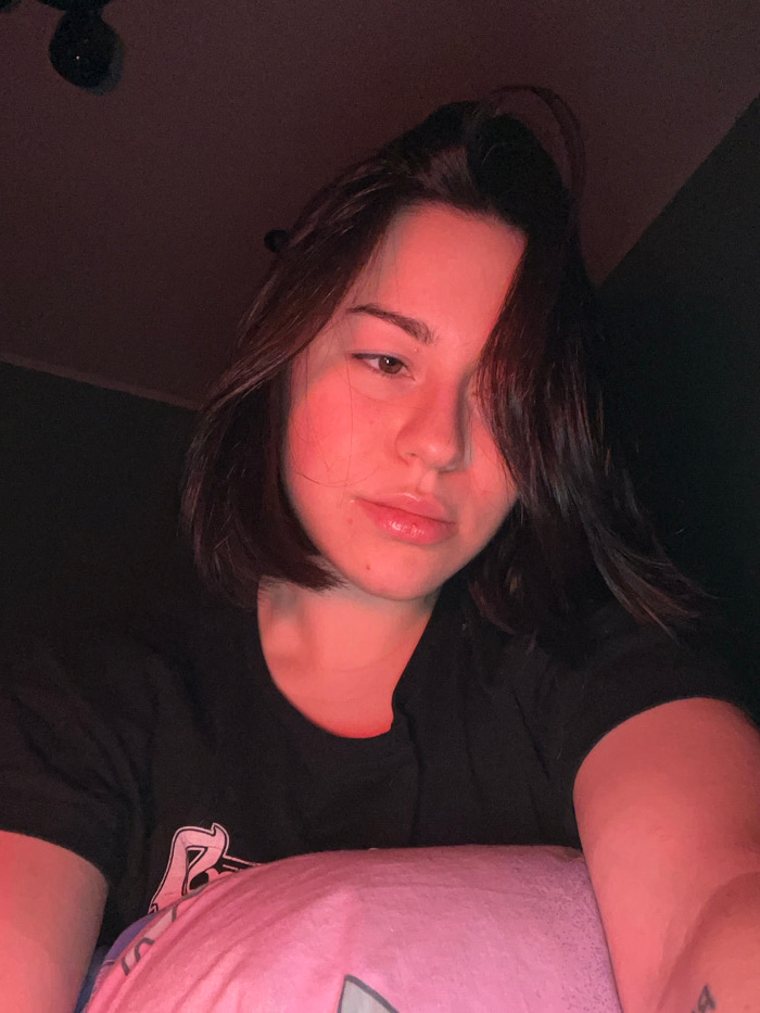 A person lies on their side, face illuminated with a rosy glow. They have short, dark hair, a light complexion, and glossy lips. They are wearing a black t-shirt with a graphic design on it. A pink pi…read more