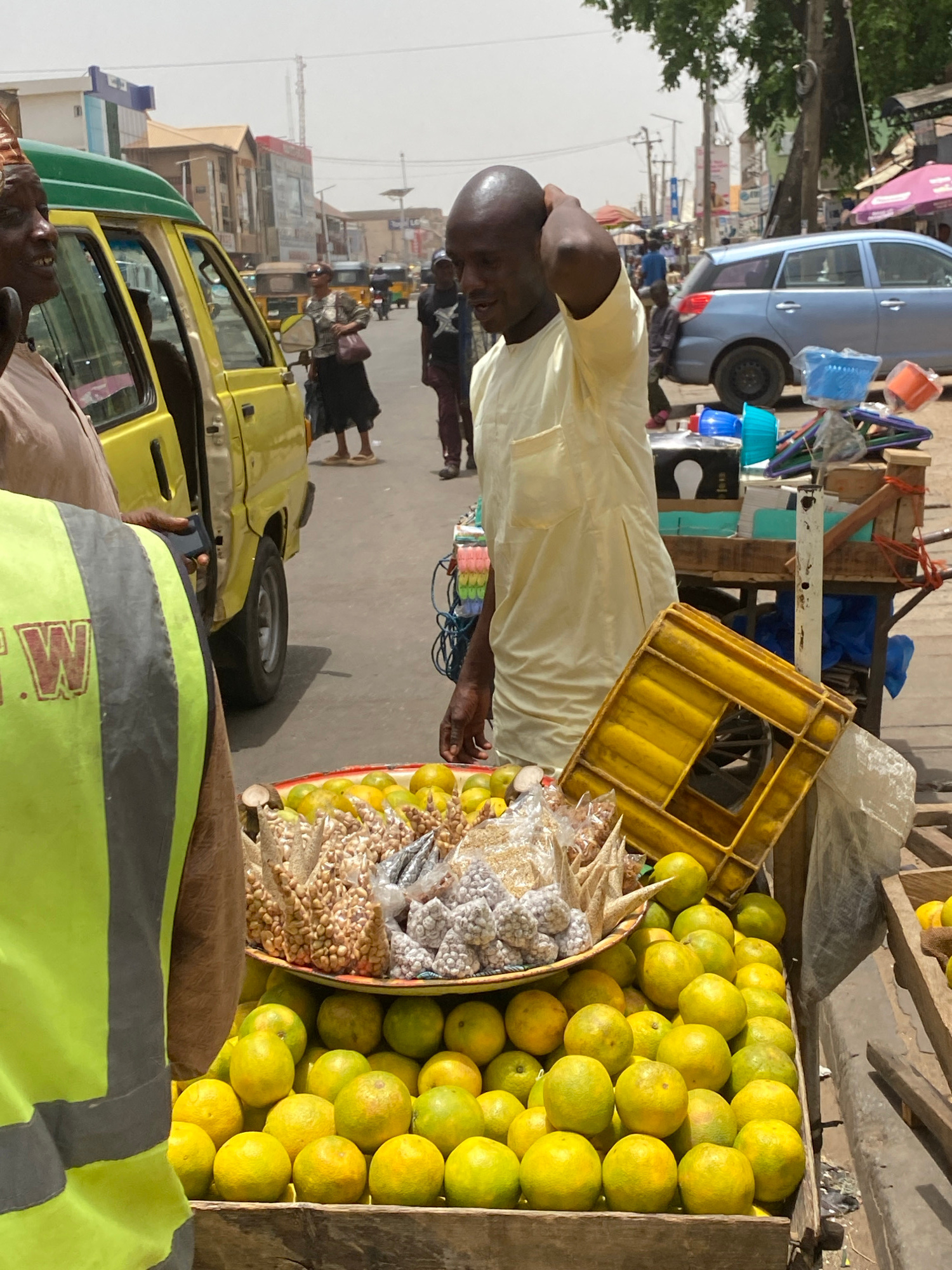 The image depicts a street scene in Maiburiji, Nigeria. A man in a light yellow robe stands beside a pushcart laden with produce, primarily oranges stacked in a wooden crate. Packaged snacks, potentia…read more
