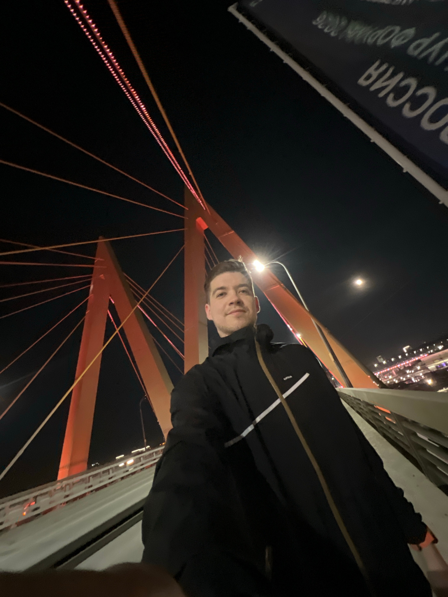 A man is on the Millennium Bridge in Kazan, Russia at night. He is facing the camera. The bridge's red cables are visible in the background, along with the night sky and moon. The Russian word "РОССИЯ…read more