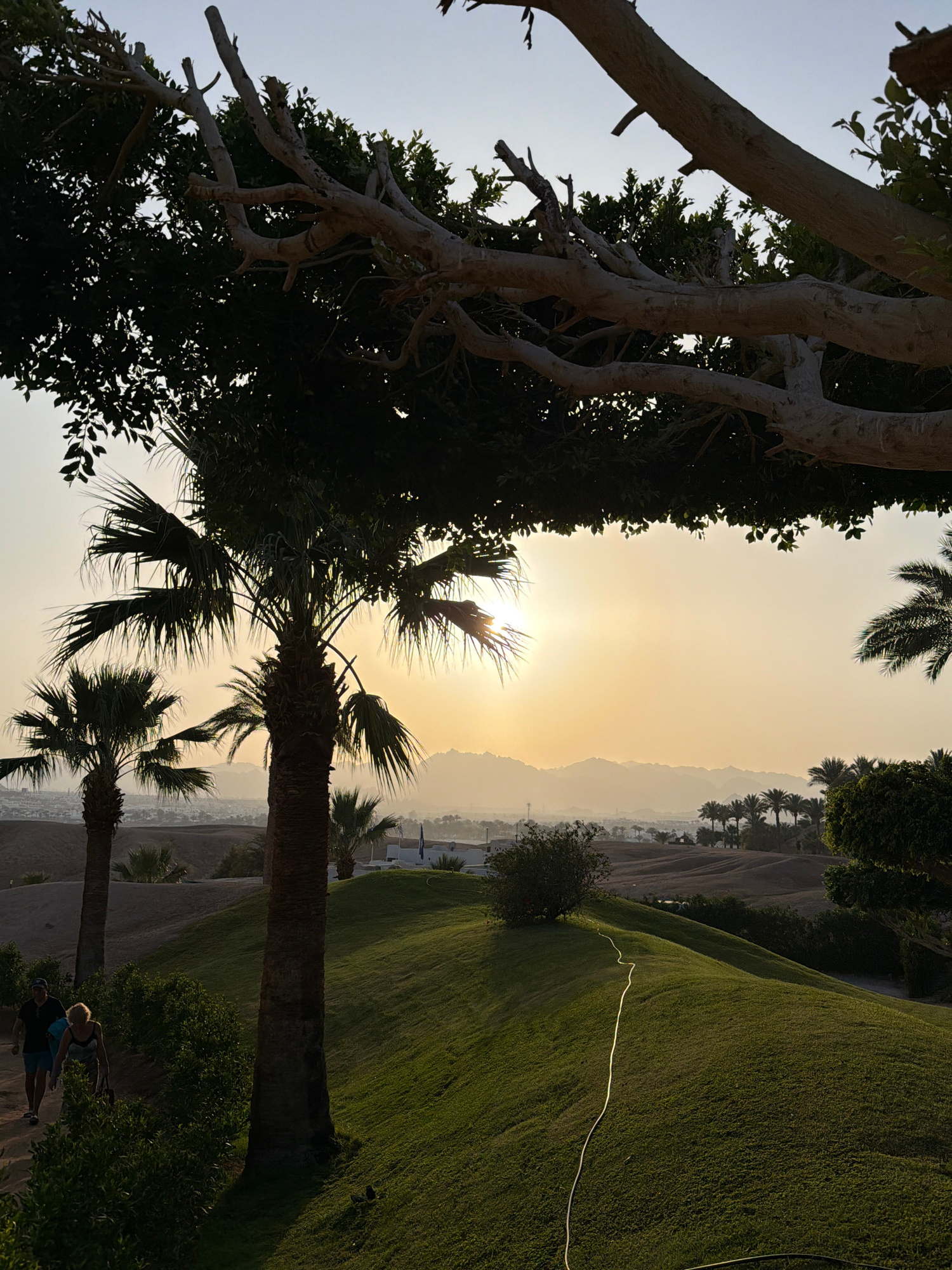This media file captures a serene outdoor scene at either sunrise or sunset, strongly suggesting a coastal or resort location like Sharm El Sheikh, Egypt. The low-lying sun, a bright golden-orange orb…read more