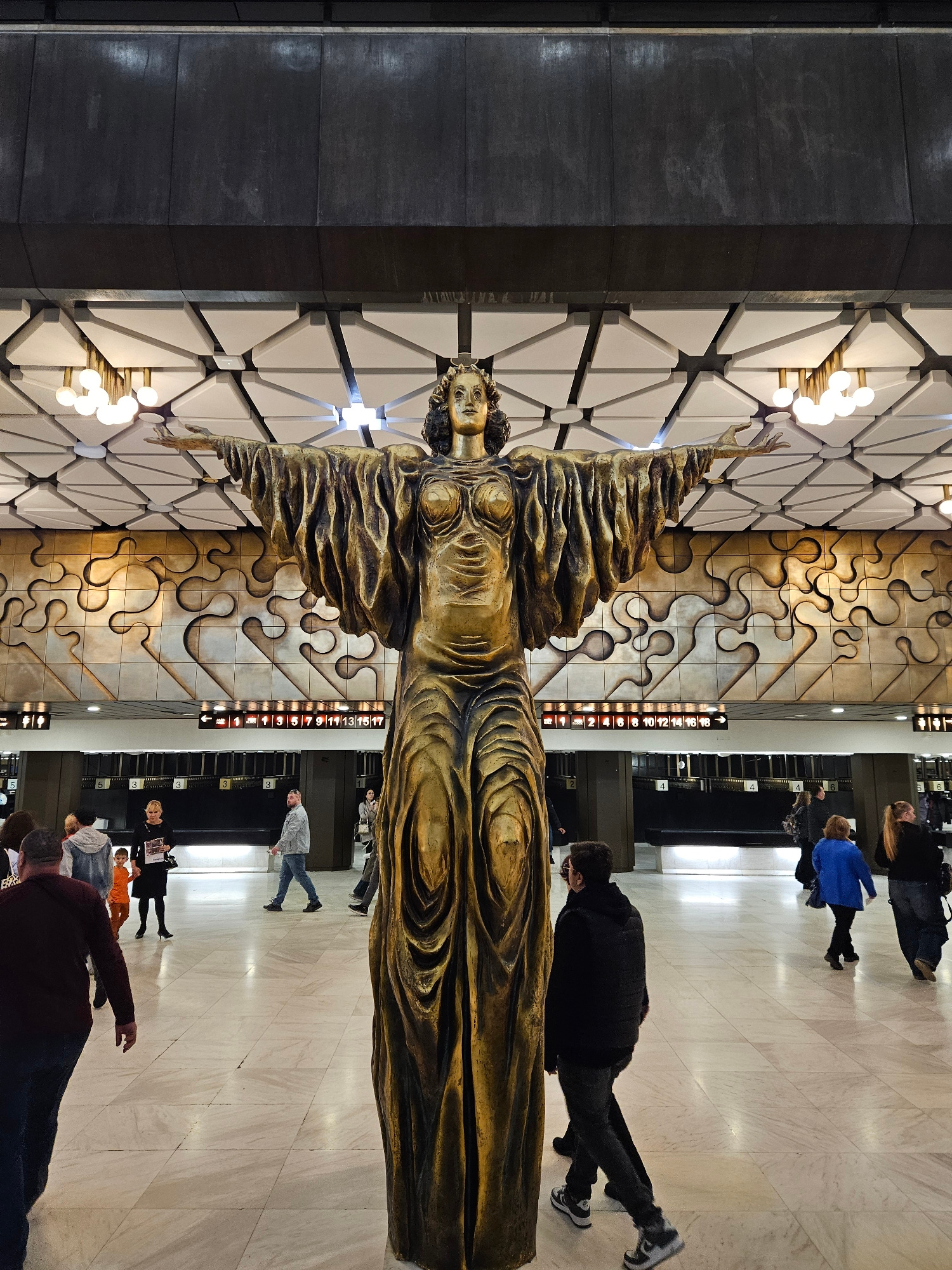 The image shows the bronze statue of Saint Sophia in Sofia, Bulgaria, at the Sofia Airport. The statue stands in an airport hall with people walking past. Behind the statue are decorative wall panels…read more