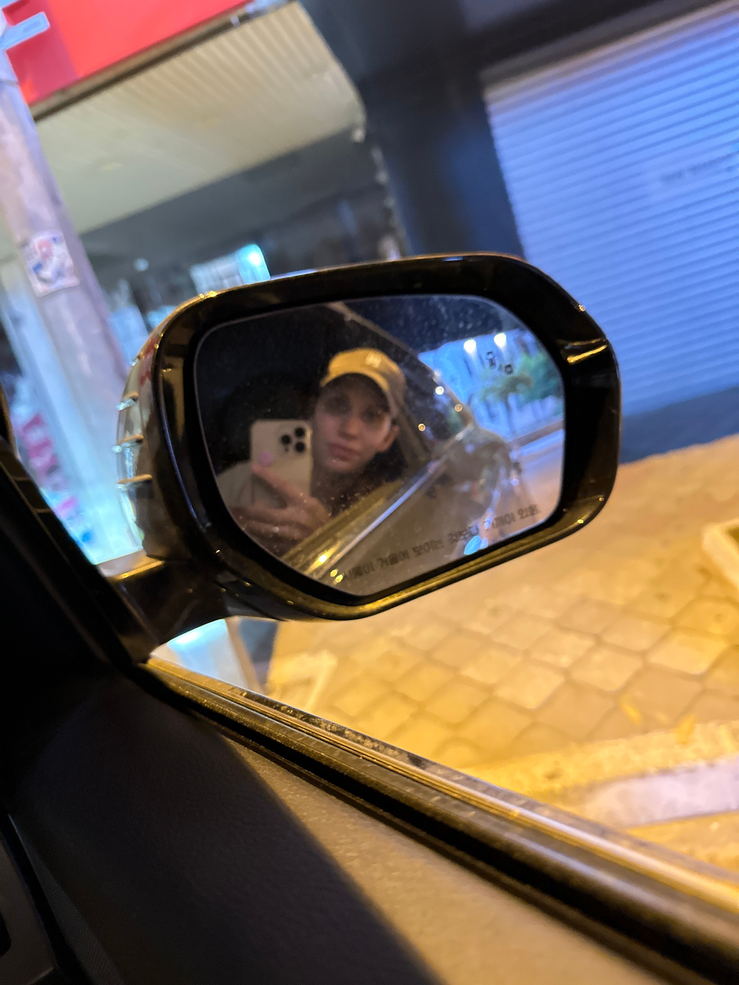 The image shows the side mirror of a car, with the reflection revealing a person holding a smartphone taking a picture of themself. The background reflected in the side mirror shows a mix of urban ele…read more