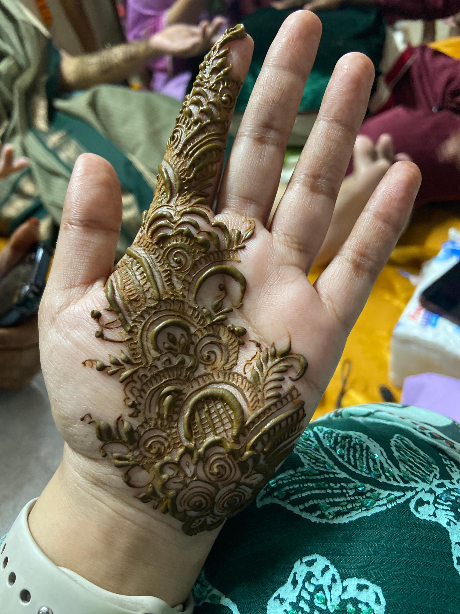 A close-up shot shows a right hand with elaborate henna designs covering the palm and index finger. The henna is a rich brown color with intricate floral and swirling patterns. The hand is light-skinn…read more