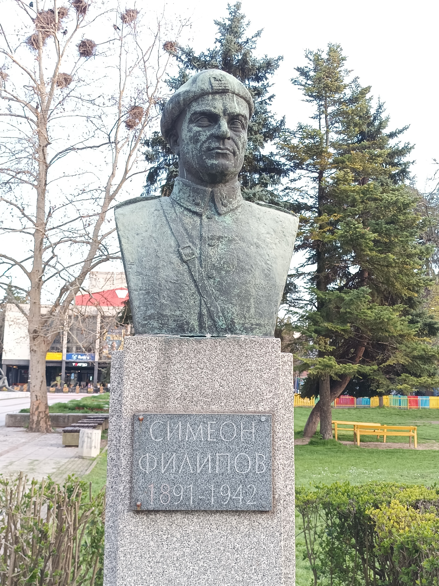 A medium shot captures the bust of Simeon Filipov, a Bulgarian soldier. The bust is dark green, seemingly made of bronze, and is positioned on a light grey stone pedestal. The pedestal has a plaque af…read more