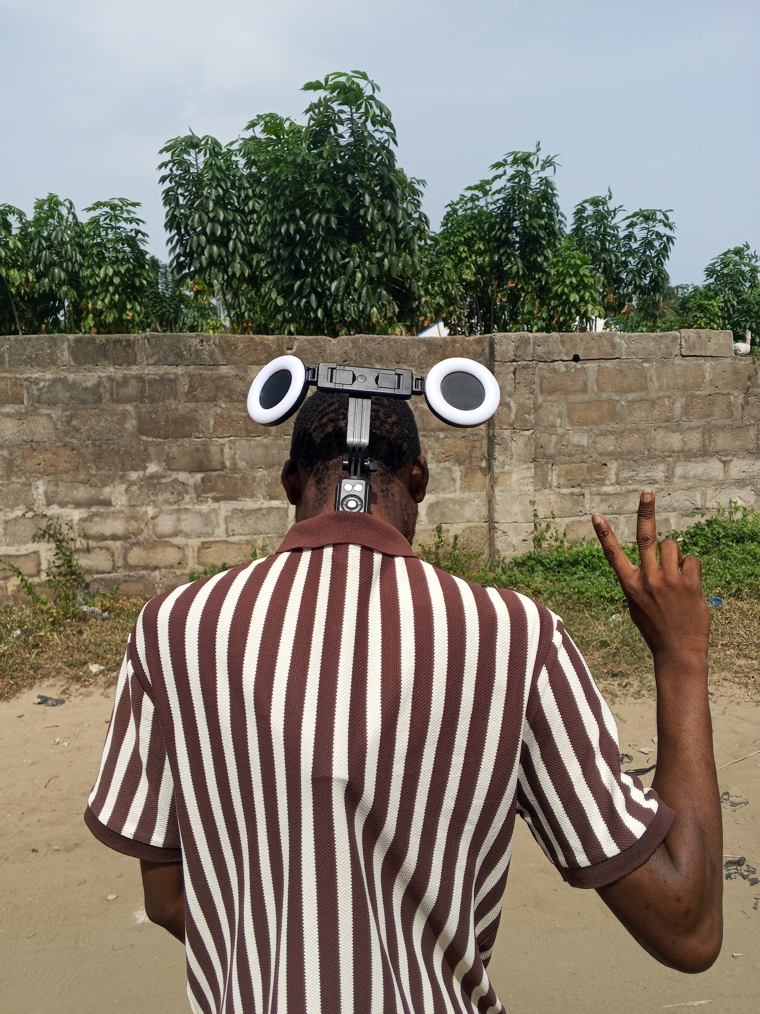 A person is seen from the back, standing in what appears to be an outdoor environment in Badagry, Nigeria. They are wearing a brown and white striped short-sleeved shirt and have a device attached to…read more