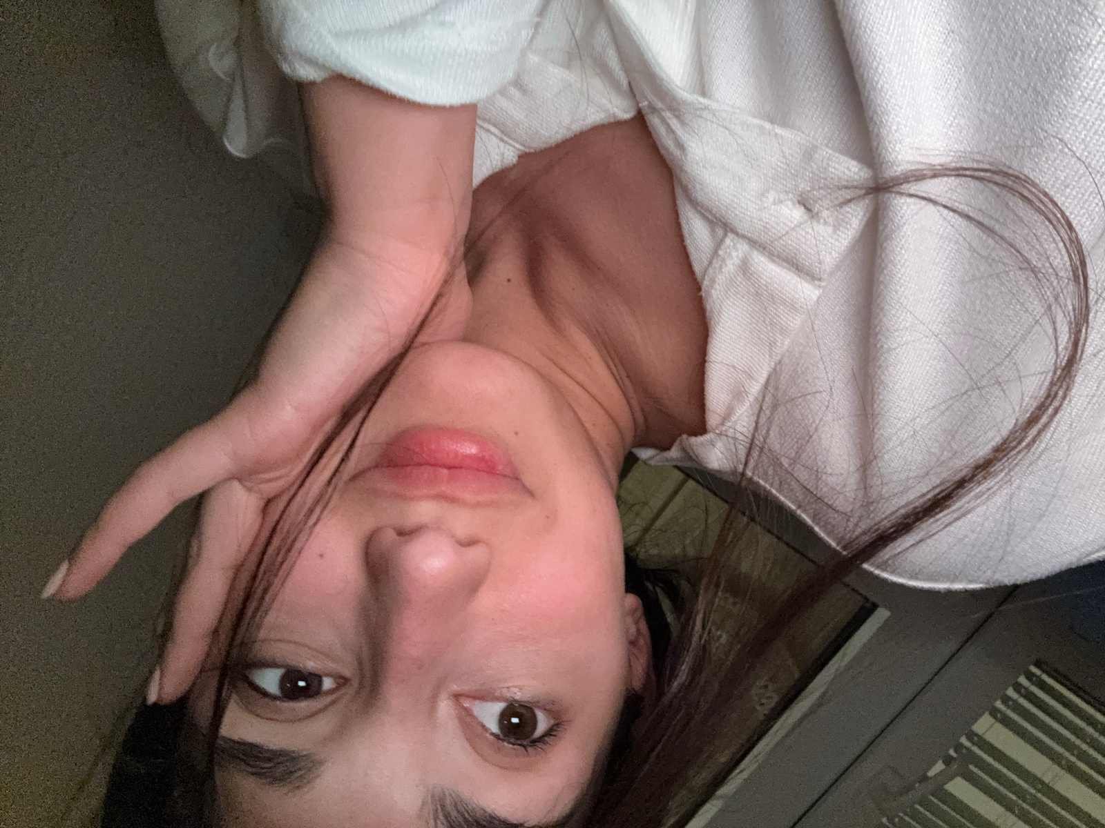 A portrait of a woman with dark brown hair and brown eyes. She is wearing a white, collared shirt. Her left hand is raised to her face. The image is oriented sideways, with the top of her head to the…read more