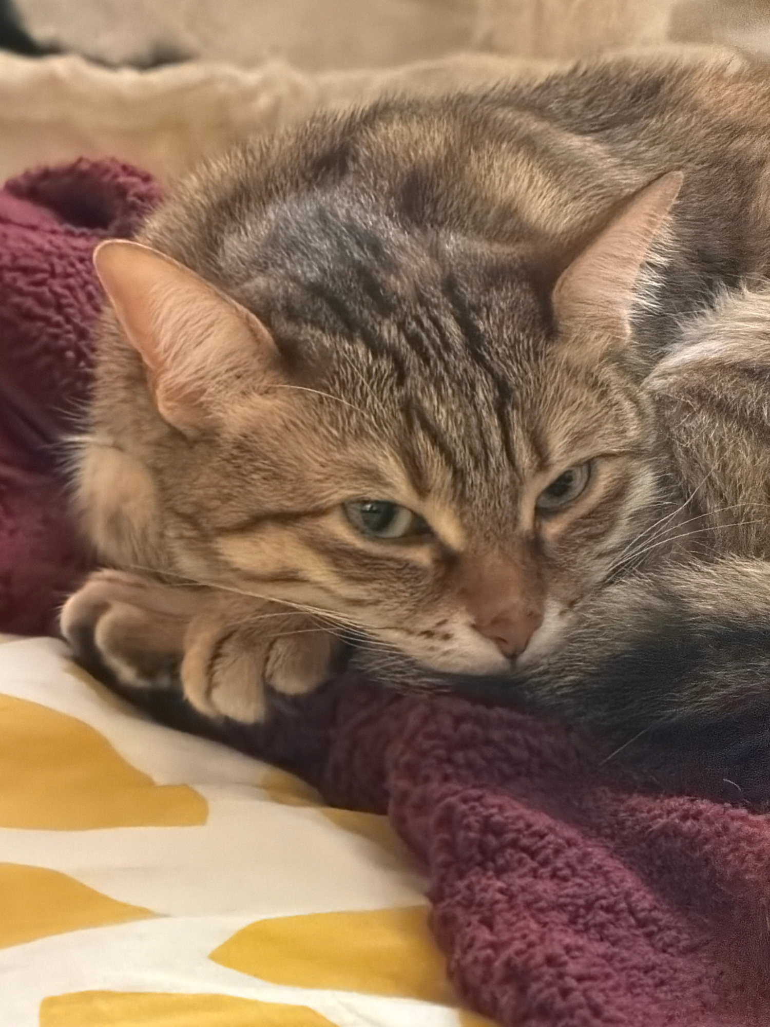 A tabby cat is nestled in a bed. The cat is brown and gray with green eyes. The bed has a maroon blanket and a white and yellow sheet. There is no indication of the city of Milan in the image.