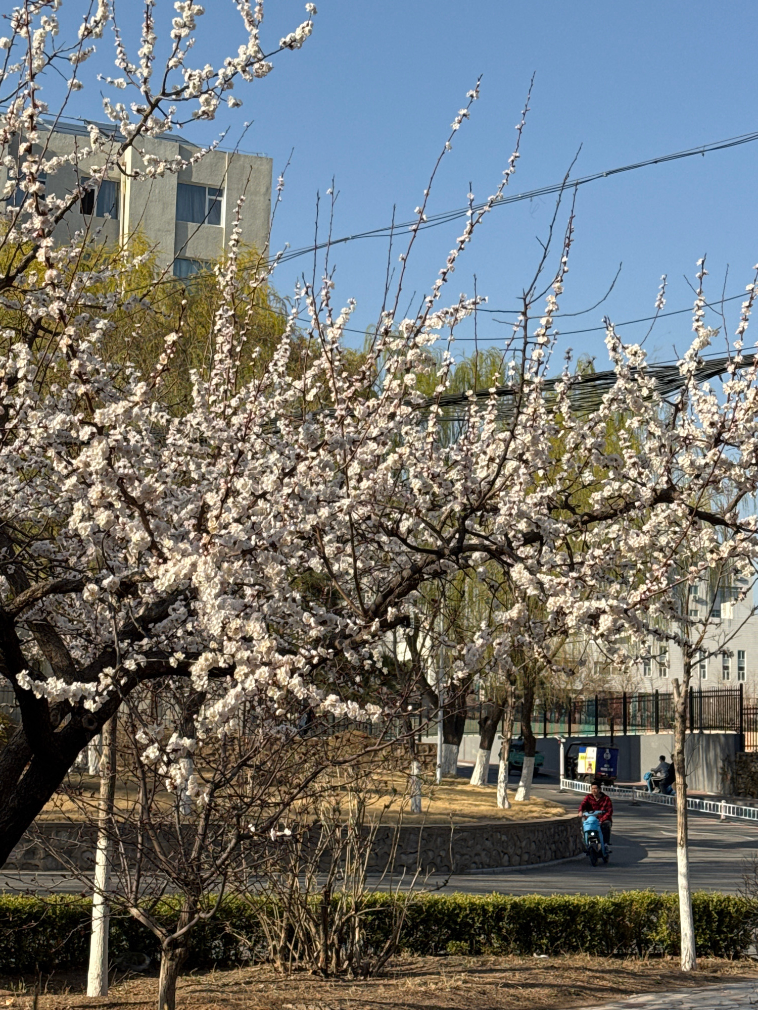 The image depicts a street scene in what appears to be Zhongtun, China, characterized by urban and natural elements. The foreground features a blooming tree with small white flowers, its branches reacβ¦read more