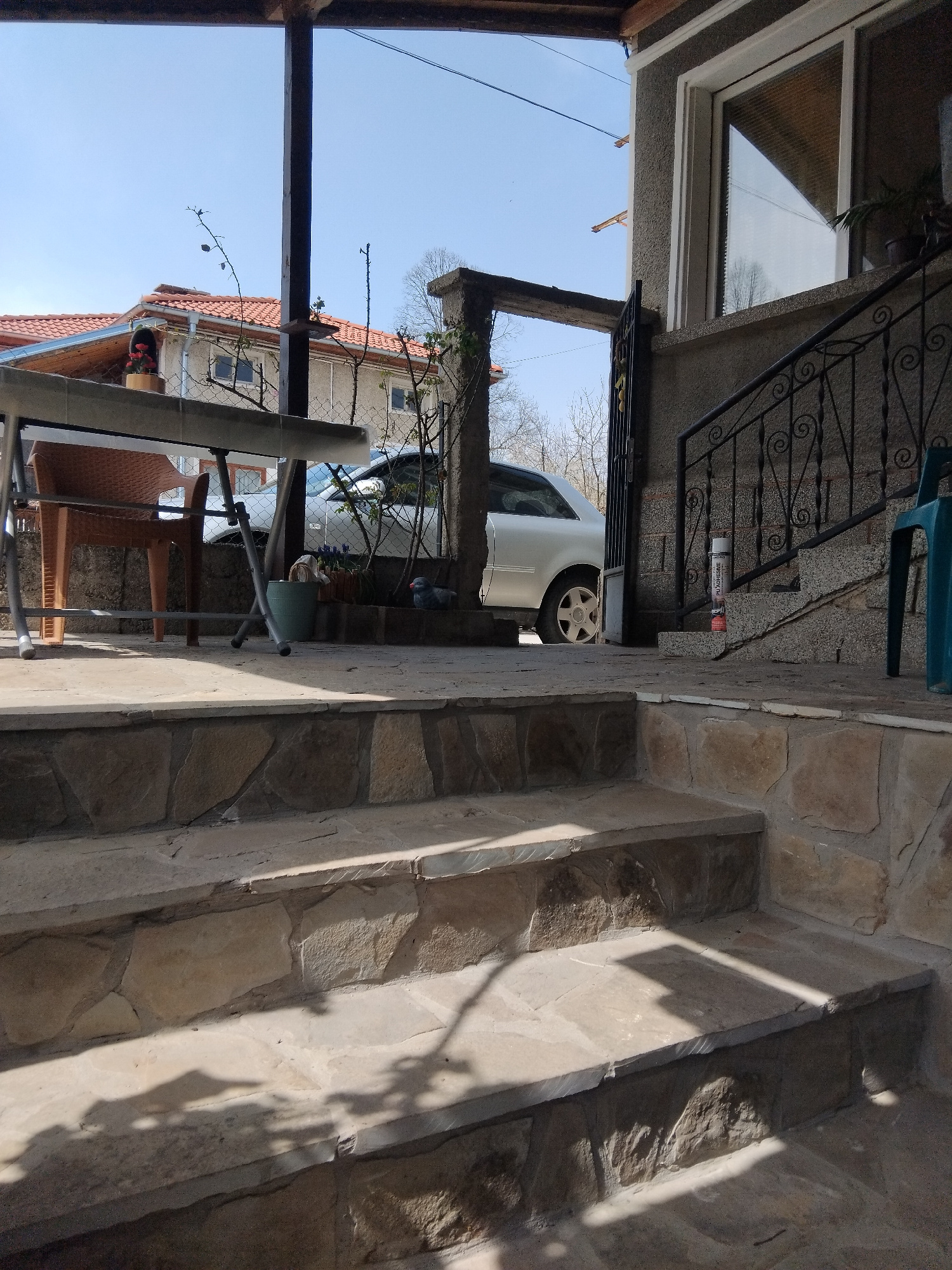 The image shows a view from a lower elevation in Apriltsi, Bulgaria, looking upwards towards a house and surrounding structures. The foreground is dominated by stone steps leading up to an outdoor are…read more