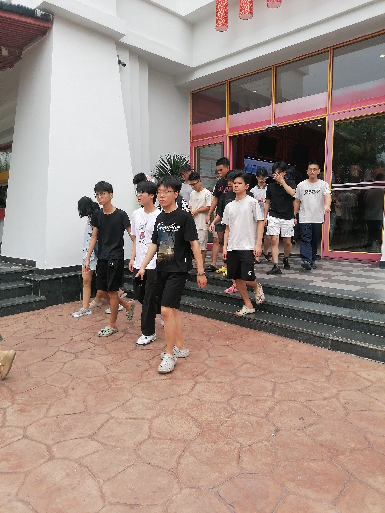 A group of young people are walking down the steps of a building. The building has a modern facade with large glass windows trimmed with red and gold. Red lanterns hang above the entrance. The steps a…read more