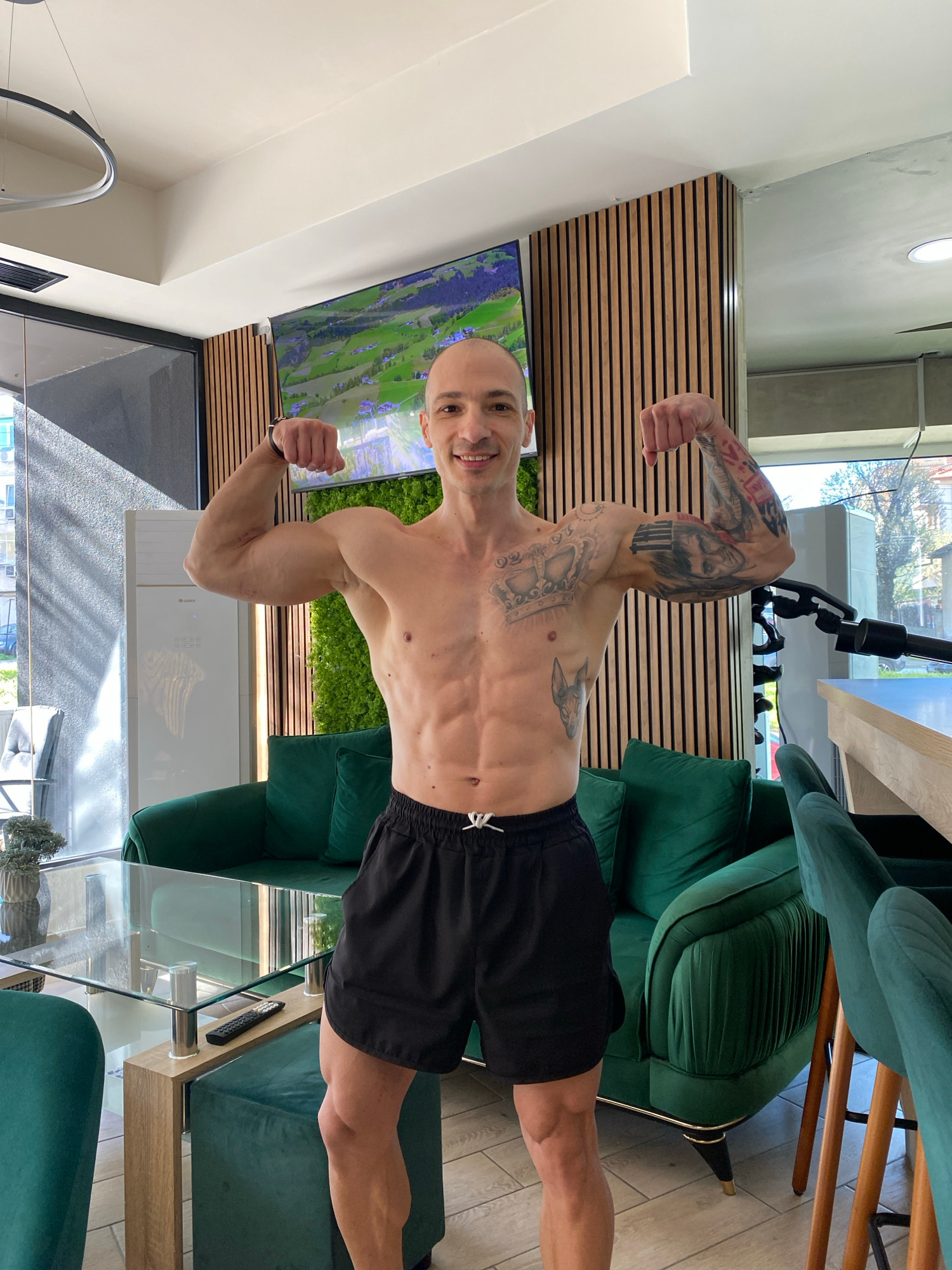 A shirtless man with a shaved head and tattoos is posing and flexing his biceps inside a well-lit building. He is wearing black shorts with a white drawstring. The interior includes green velvet chair…read more