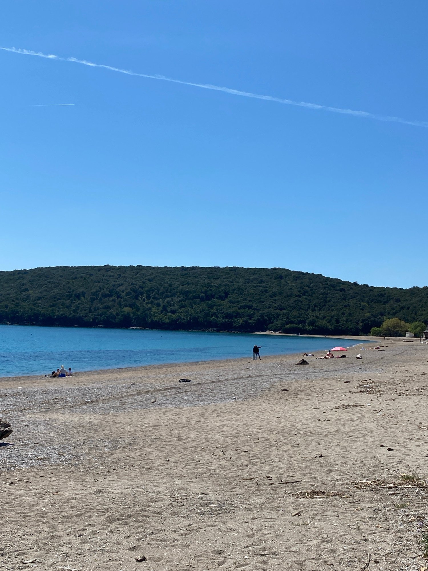 The image shows a beach in Prijevor, Montenegro, bordered by a forested hill on one side and the sea on the other. The beach is sandy, with scattered debris. Several people are present, some near the…read more