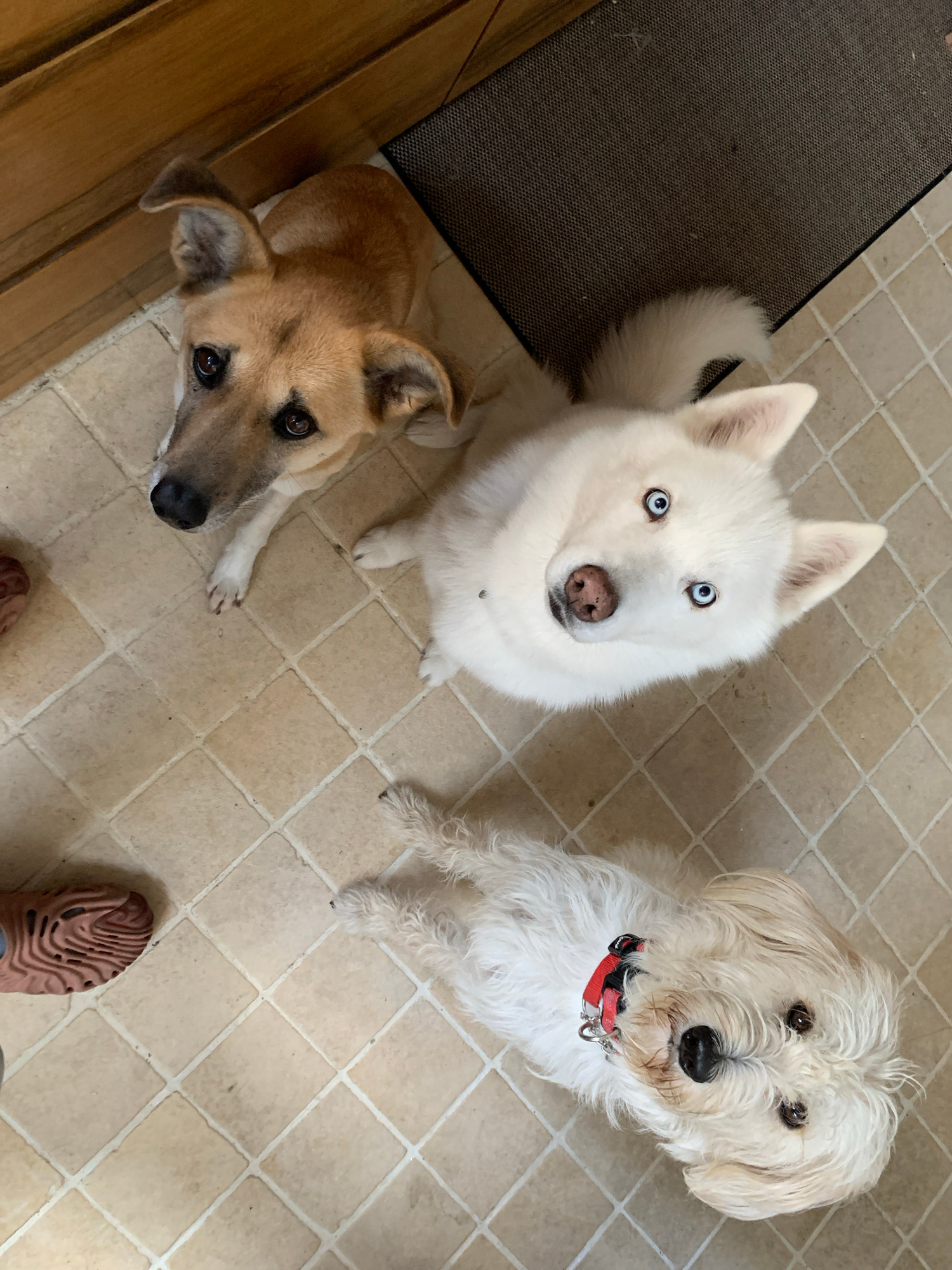 An overhead view depicts three domestic dogs situated on a light beige tiled floor with white grout. In the upper left background, light brown wooden cabinetry or paneling is visible, while a dark gre…read more