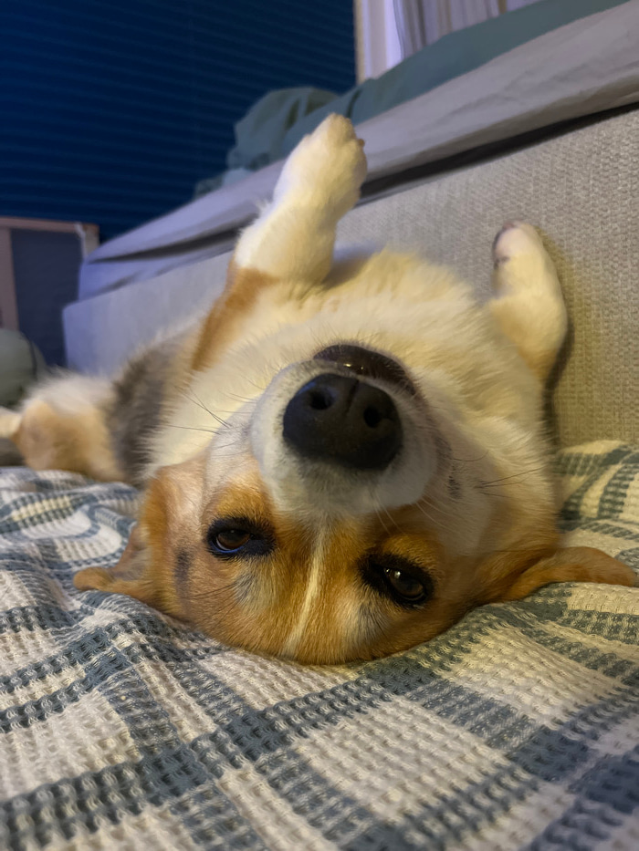 A charming corgi rests on its back, paws up, with its head tilted upward towards the camera. The dog's face is the primary focus, showcasing its brown eyes and black nose. A plaid blanket provides a t…read more