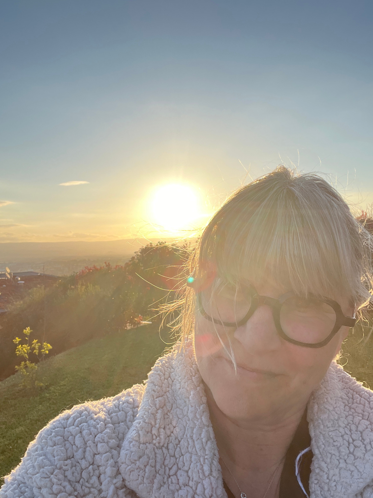 A woman with short gray hair and glasses stands in front of a bright sun setting over what appears to be a landscape. She wears a light-colored, textured jacket. The background features a gradient of…read more