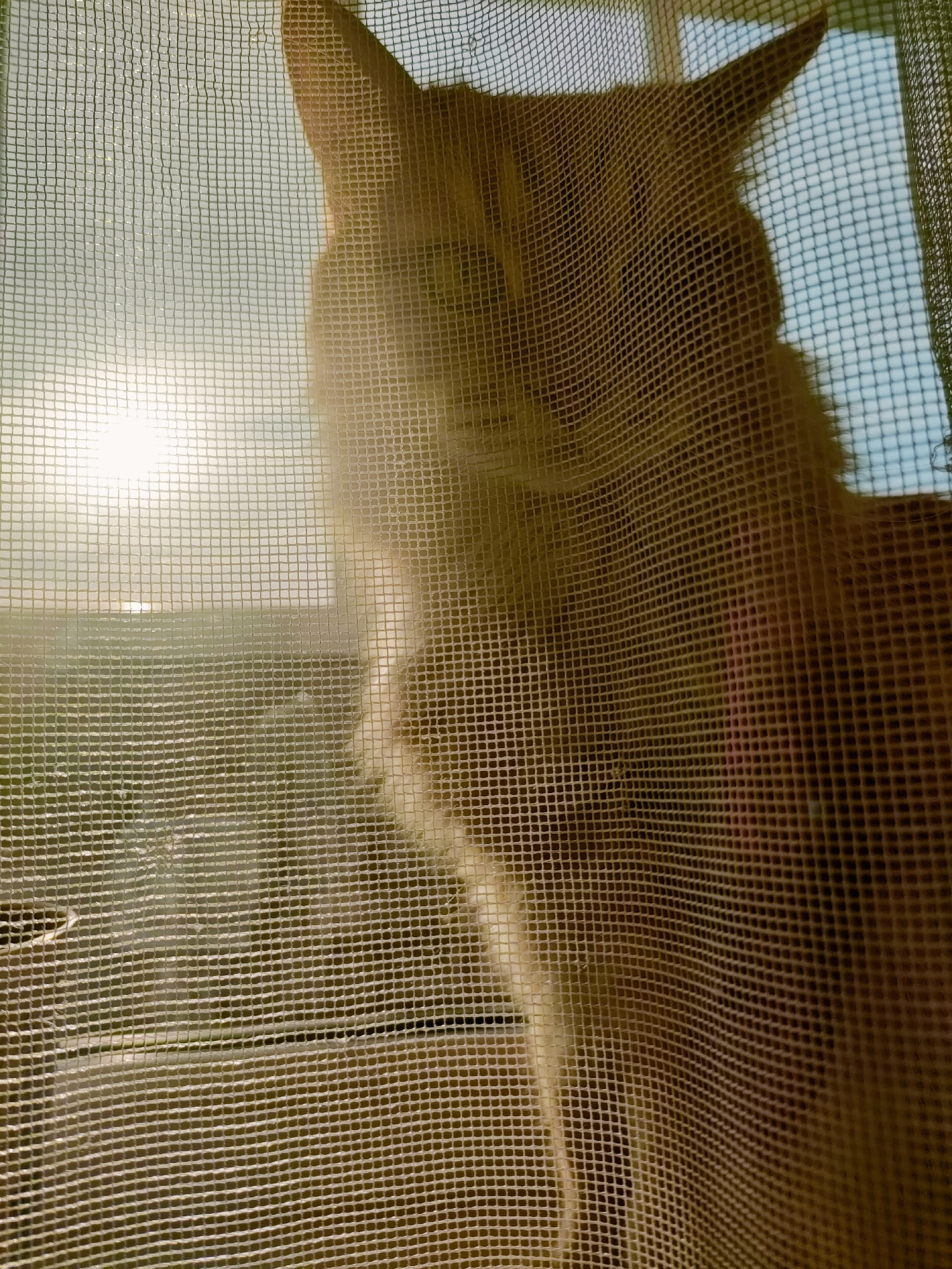 A ginger cat is standing behind a window screen, with the sun rising or setting over a body of water. The location, Ufa, Russia, cannot be verified from the visual elements of the image. The cat is po…read more