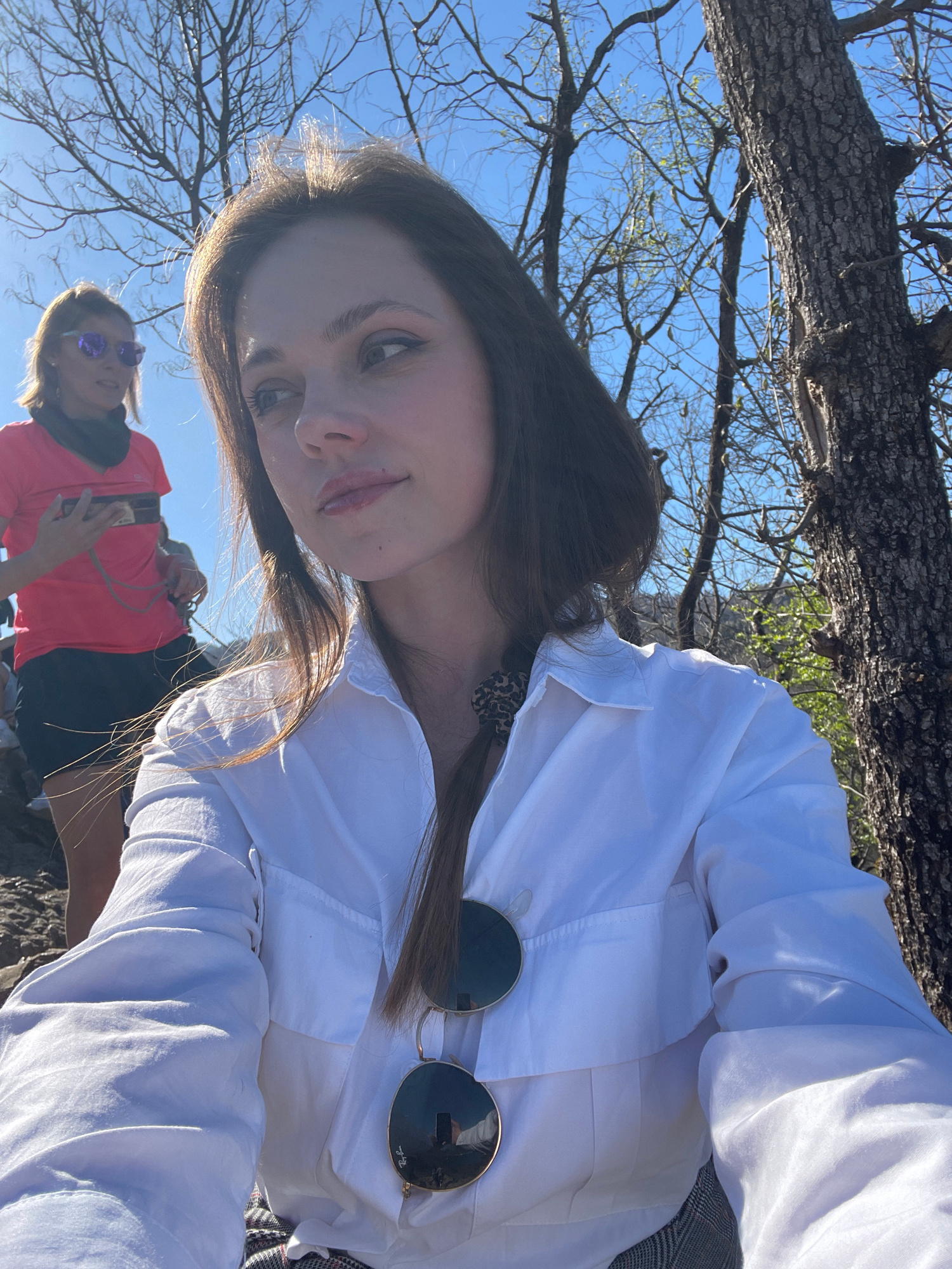 A daytime, medium-shot, outdoor photograph depicts a young woman wearing a white collared shirt with gold-rimmed sunglasses clipped to the collar. The woman has long brown hair. Behind and below her i…read more