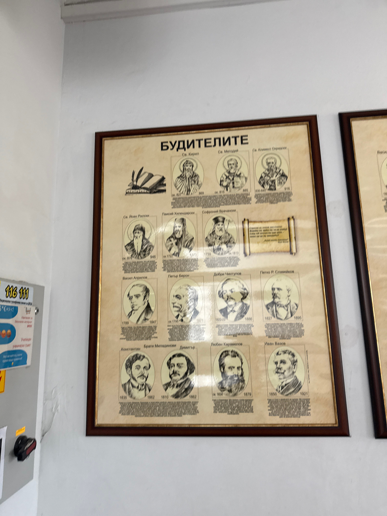 A framed, sepia-toned poster titled "БУДИТЕЛИТЕ" (Awakeners/Educators) hangs on a white wall in what appears to be an indoor public or educational setting in Varna, Bulgaria. The poster features a gri…read more