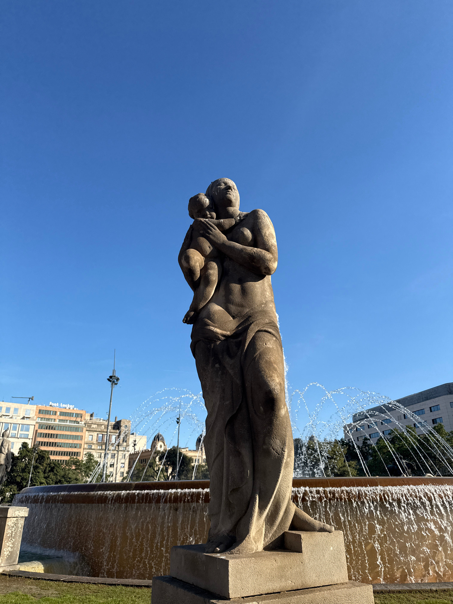 The image shows the Fountain of a Mother, located in Barcelona, Spain. It depicts a stone sculpture of a mother holding a child. The fountain water is visible. Buildings and trees are in the backgroun…read more