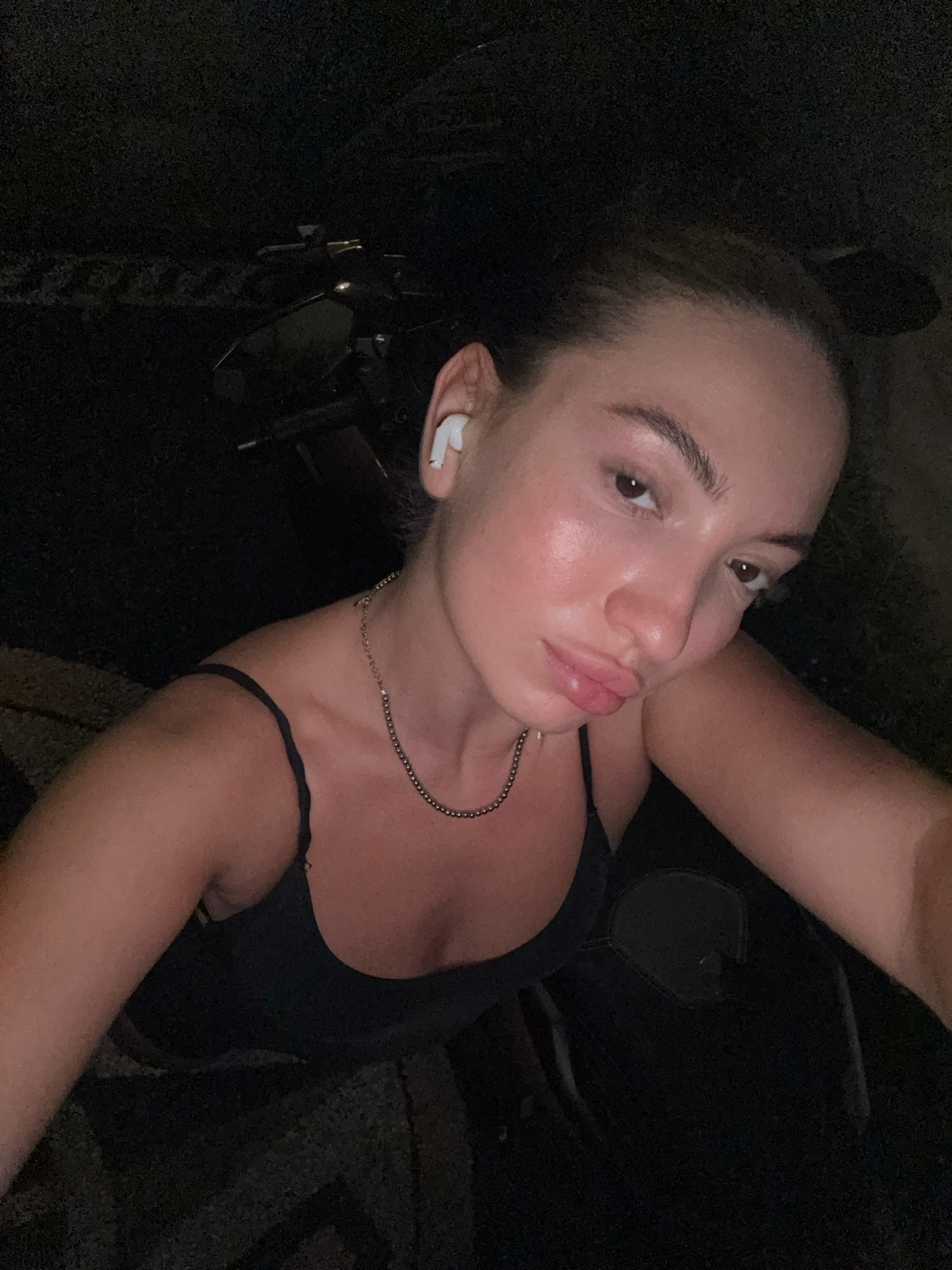 A young Caucasian woman is taking a selfie in a dimly lit outdoor environment. She has light skin, light brown hair pulled back, and is wearing a black tank top and a delicate gold necklace. An earbud…read more